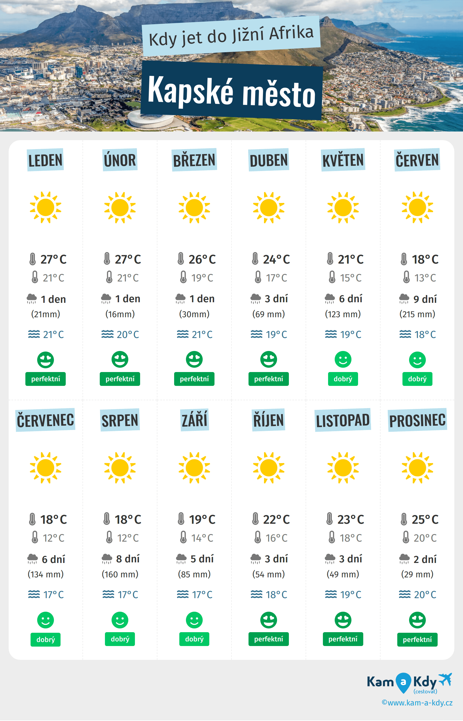 Celkově vzato, Kapské město je destinací, kterou lze navštívit po celý rok. Nicméně pro optimální zážitek preferujte měsíce leden, únor, březen, duben, říjen, listopad a prosinec. Vše záleží na vašich preferencích, ať už jde o klima, turistický ruch nebo aktivity, které chcete podniknout.