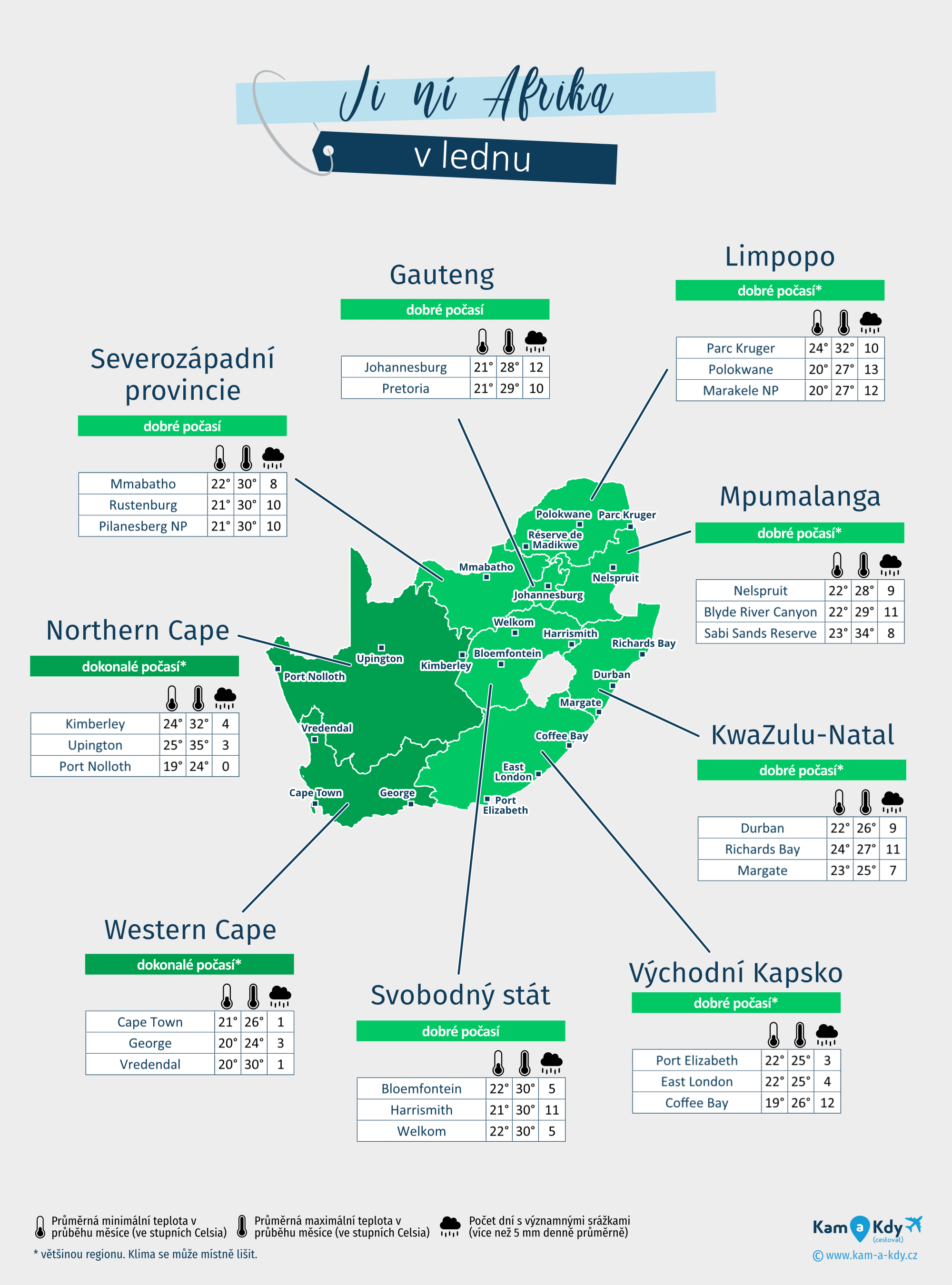 | Mpumalanga (Mbombela, Blyde River Canyon, Sabi Sands Reserve...) | 77°F na 94°F | 8 à 15 dní | dobré počasí* | |
