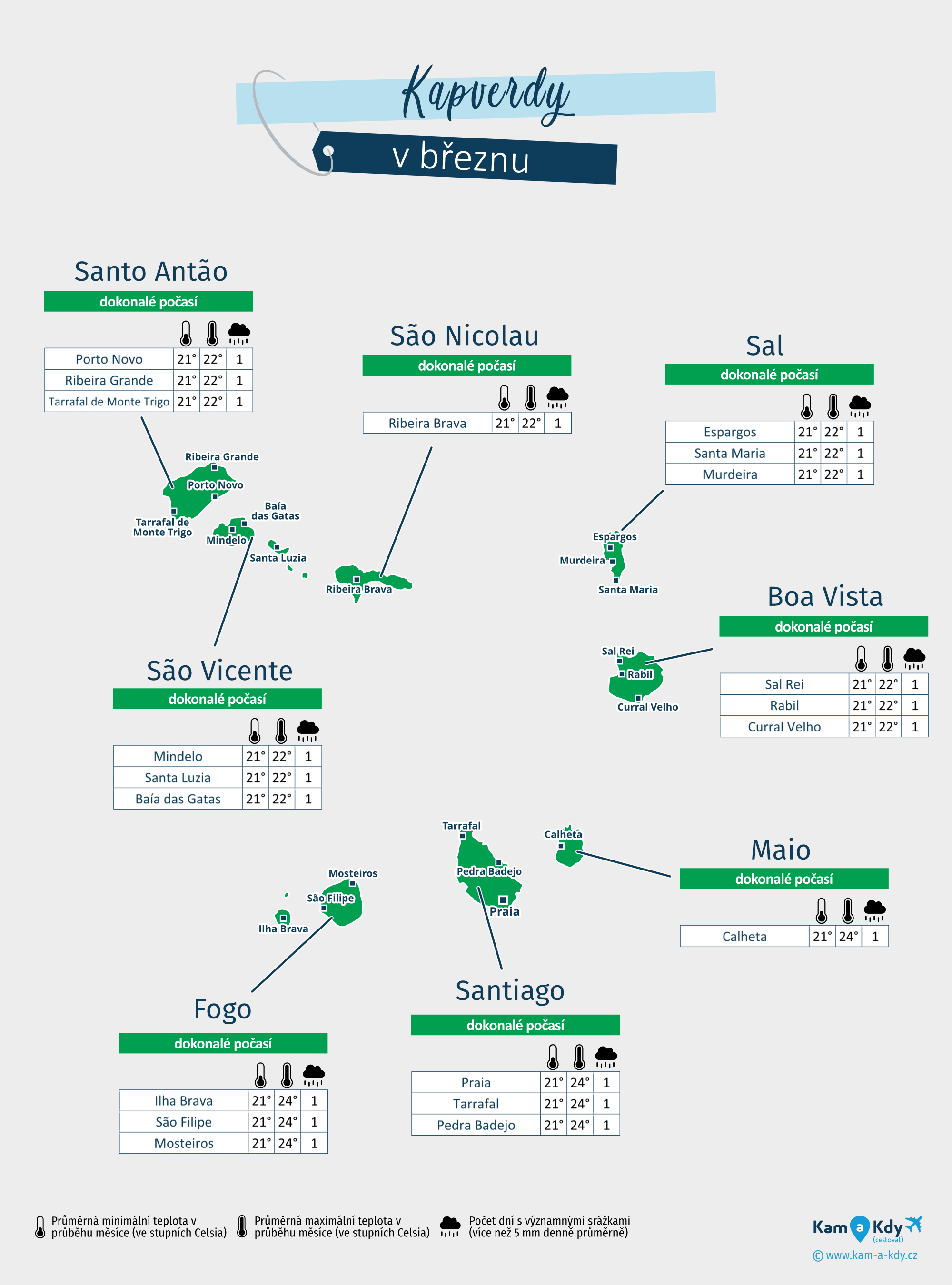Údaje o počasí pro Kapverdy v březnu jsou odvozeny z průměrné předpovědi počasí z roku 2009 na Kapverdách. Existuje míra chyb a tyto prognózy lze považovat pouze za obecné informace. Počasí na Kapverdách se mírně liší od roku k roku, ale tyto předpovědi by měly omezit překvapení. Takže si můžete sbalit tašky a zkontrolovat, kdy je nejlepší čas roku pro navštívení do Kapverdy.