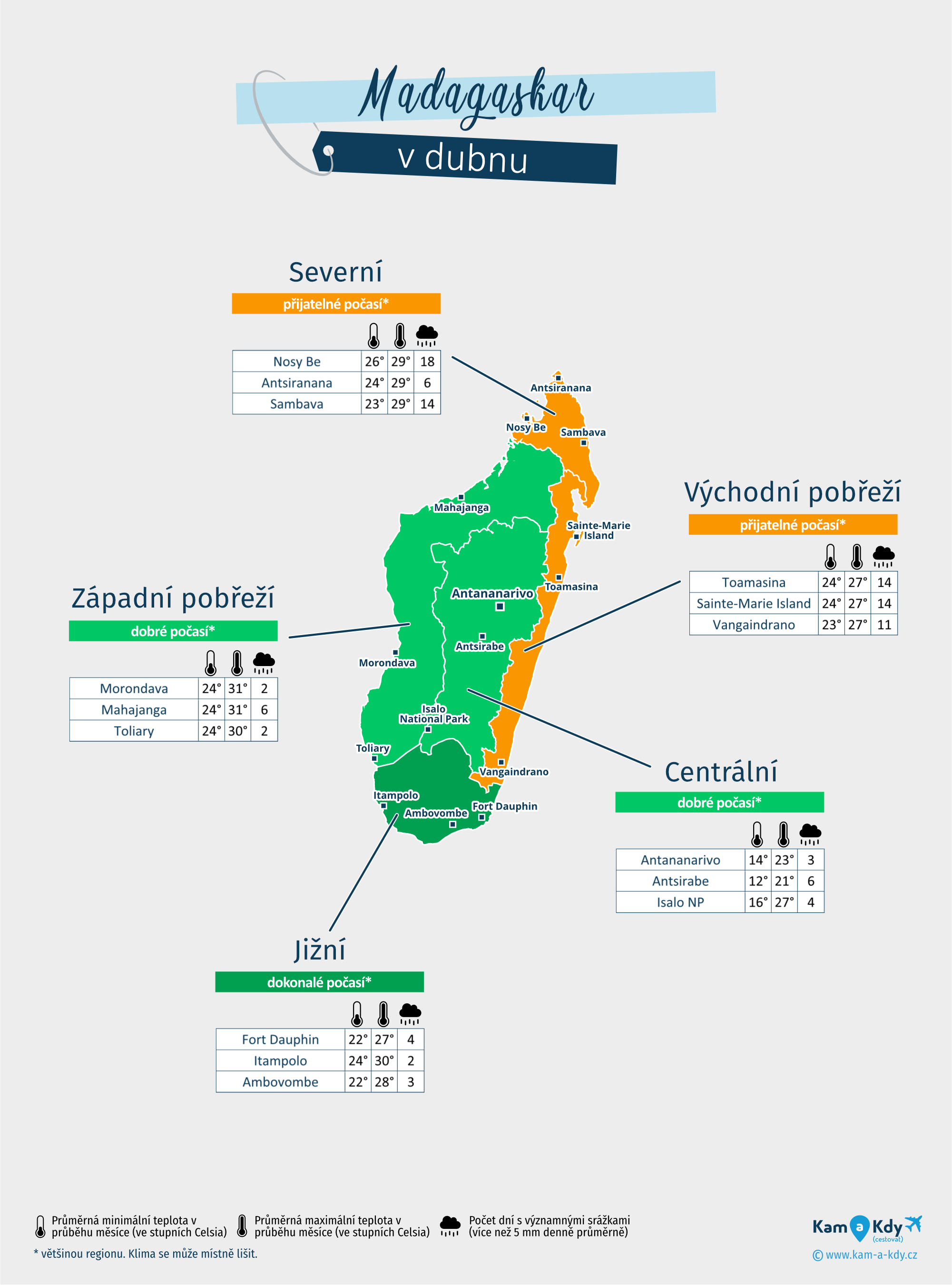 | Centrální (Antananarivo, Antsirabe, Národní park Isalo...) | 70°F na 81°F | 3 à 6 dní | dobré počasí* | |