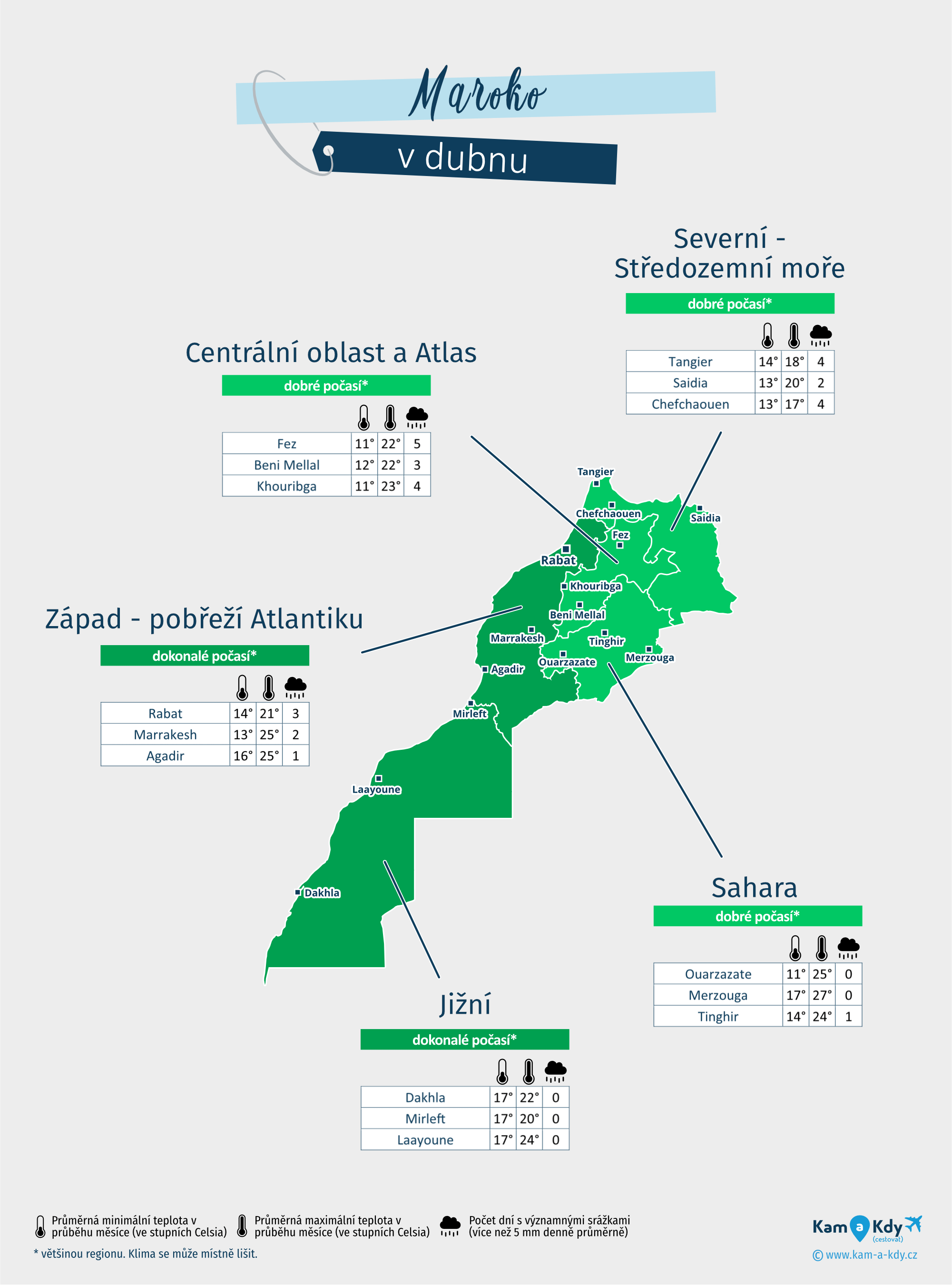 | Západ - pobřeží Atlantiku (Rabat, Marrakéš, Agadir...) | 70°F na 85°F | 0 à 5 dní | 65°F na 67°F | dokonalé počasí* |