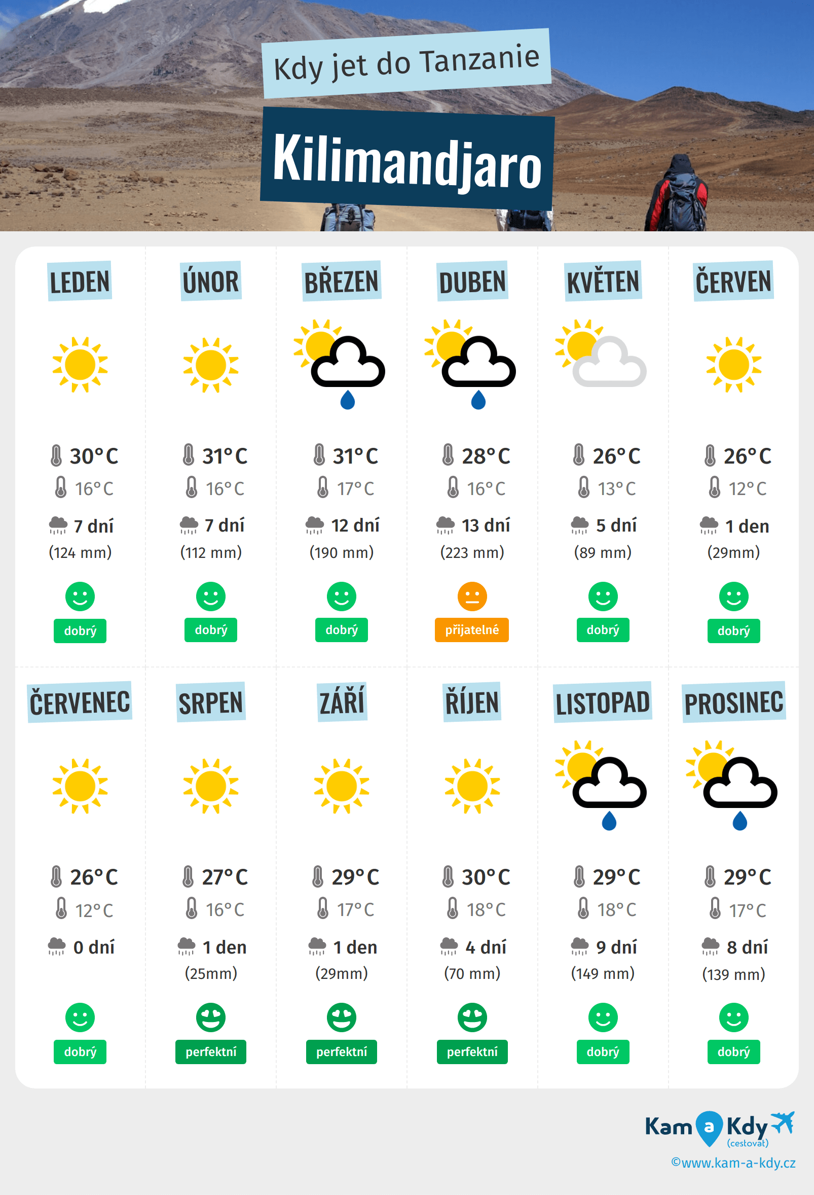 - Nejlepší měsíce pro dobré počasí v Kilimandjaro jsou Leden, únor, Březen, Květen, červen, červenec, Srpen, Září, říjen, Listopad a Prosinec