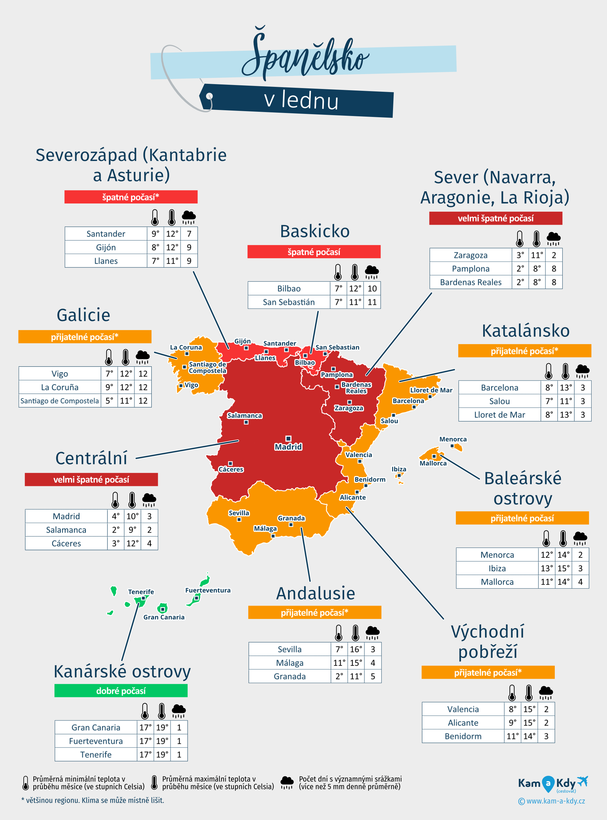 | Centrální (Madrid, Salamanca, Cáceres...) | 45°F na 58°F | 2 à 9 dní | velmi špatné počasí | |