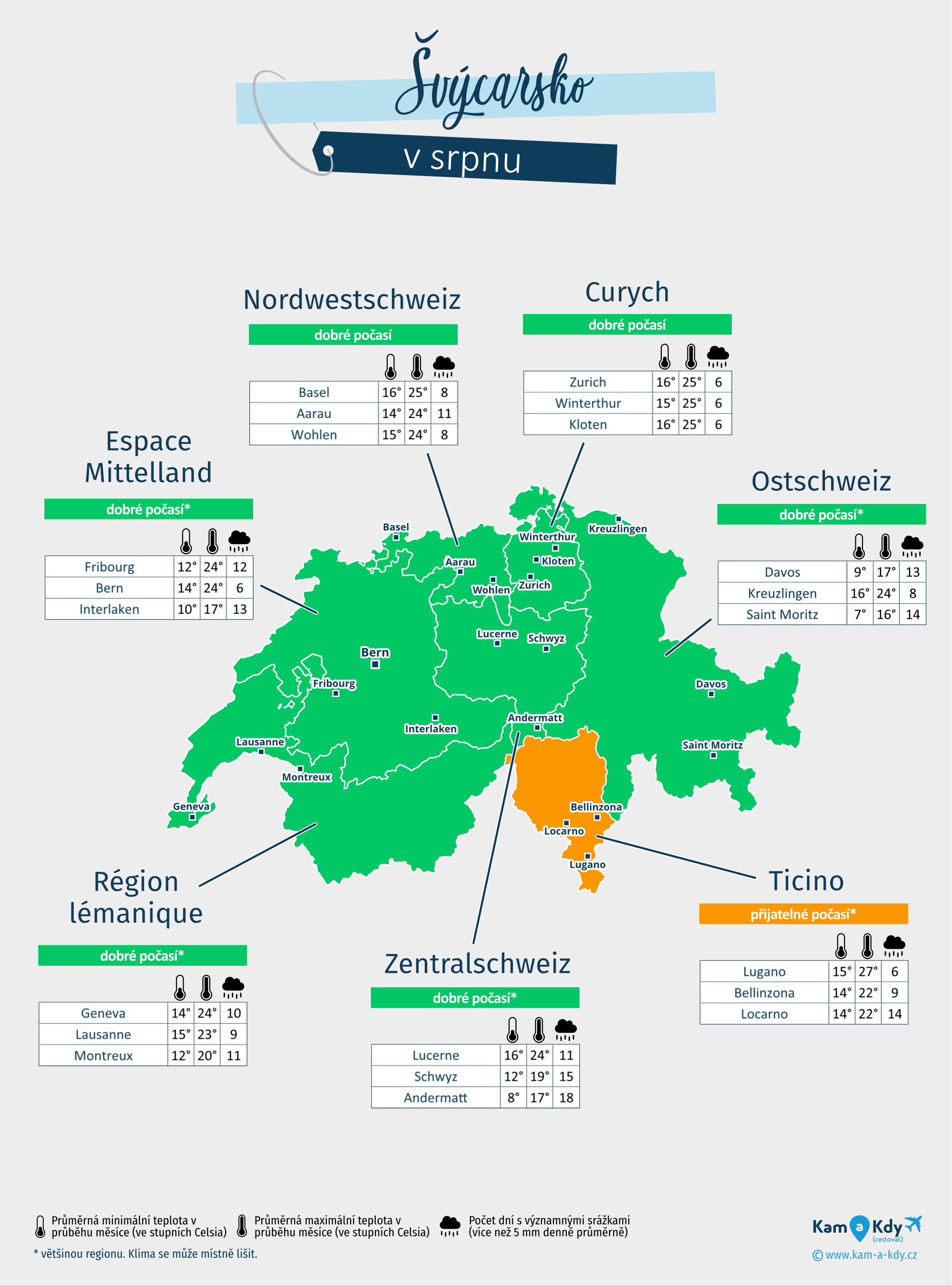 | Nordwestschweiz (Basilej, Aarau, Wohlen...) | 76°F na 77°F | 8 à 11 dní | dobré počasí |