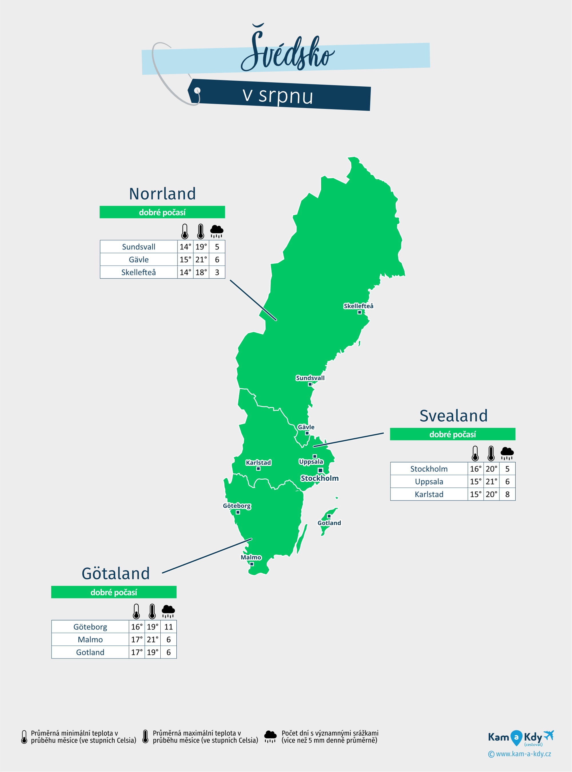 | Götaland (Göteborg, Malmo, Gotland...) | 67°F na 72°F | 4 à 13 dní | 65°F na 67°F | dobré počasí |