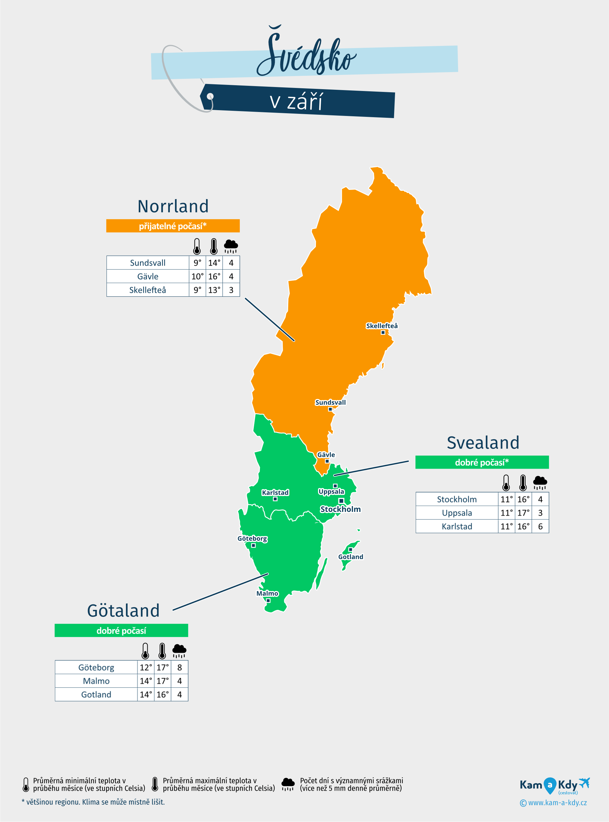 Klima ve Švédsku v září je dobrý až přijatelné v závislosti na oblasti a městu.