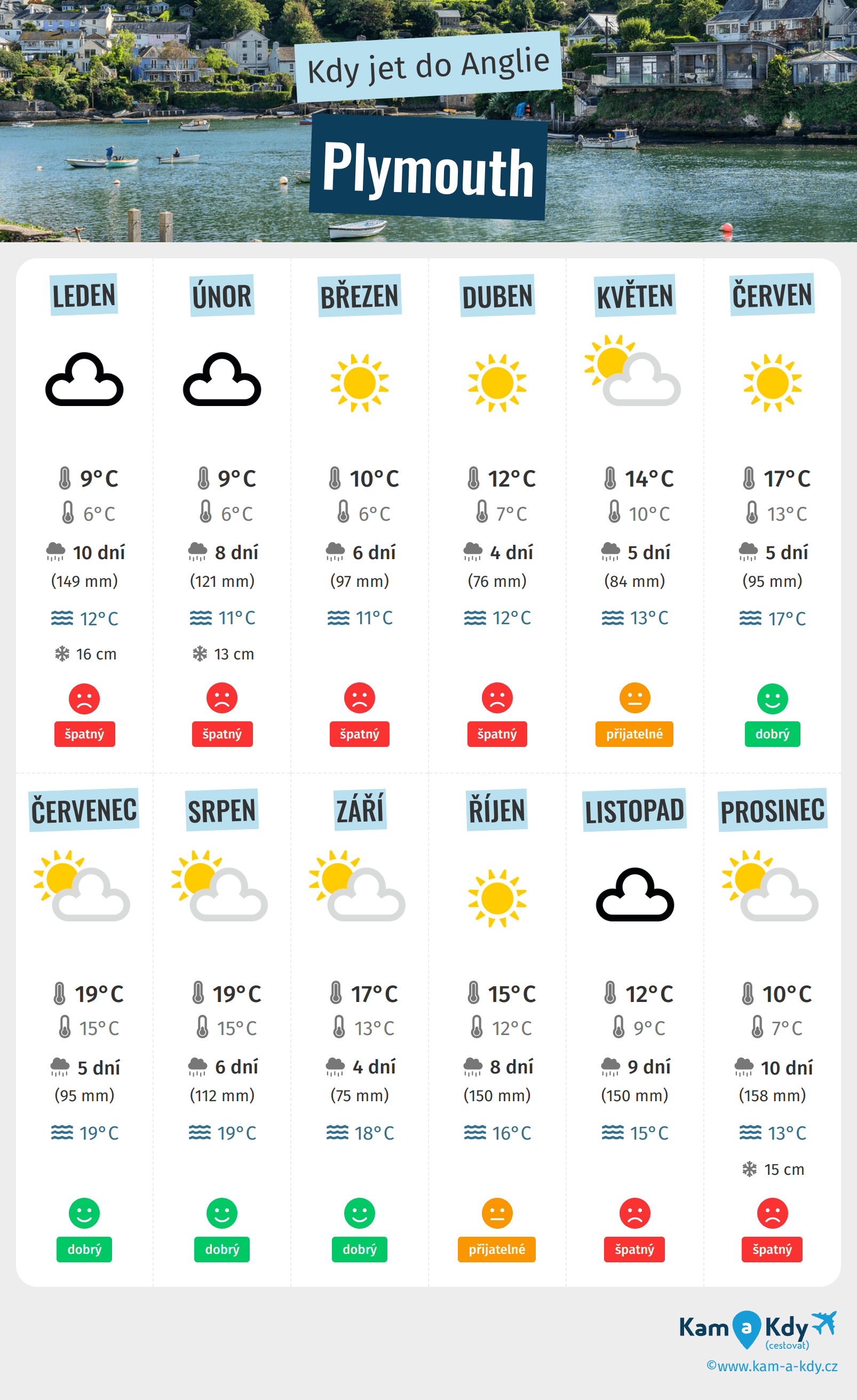 - Nejlepší měsíce pro dobré počasí v Plymouth jsou červen, červenec, Srpen a Září