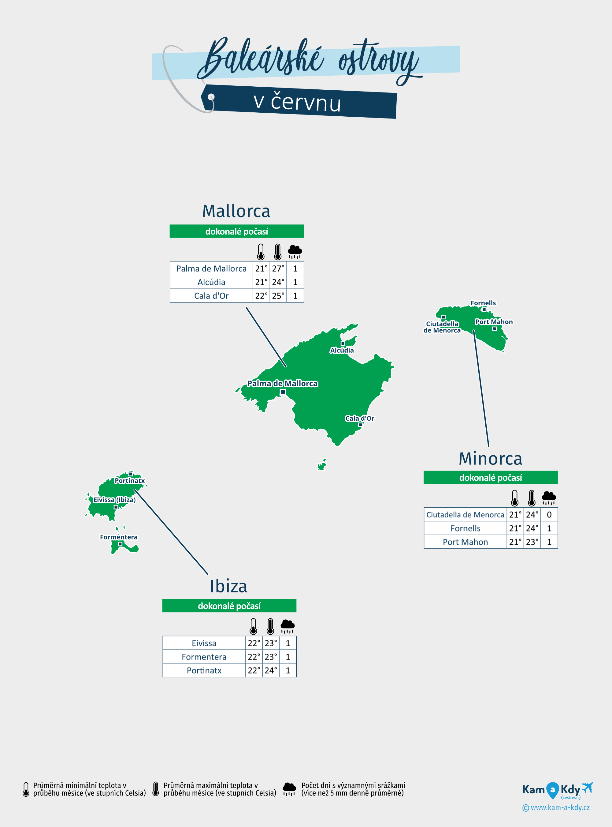 Zde najít máte předpověď počasí na měsíc červen pro nejoblíbenější města v Baleárské ostrovy. Tyto predikce jsou pravděpodobnosti pro červen od zpráv o počasí za více let. Procento udává pravděpodobnost, že počasí bude jak zmíněno.