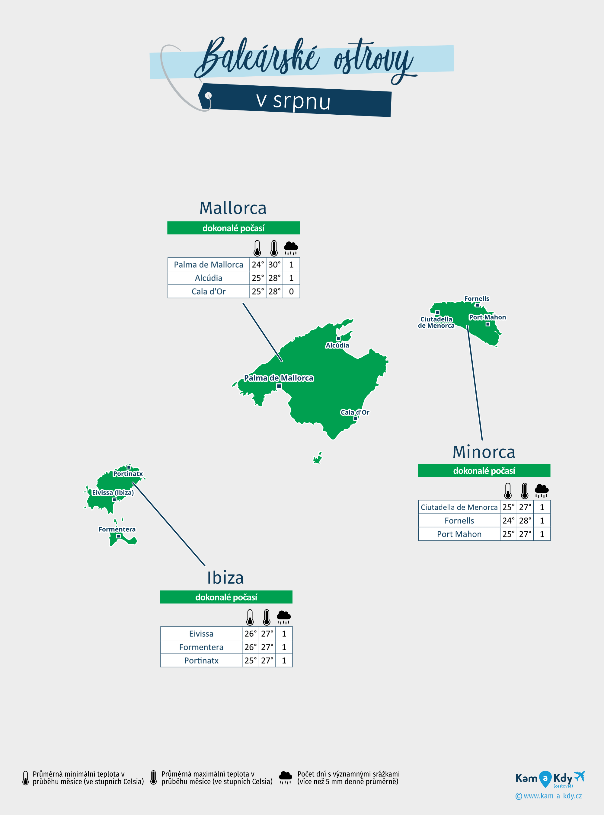 Níže přístup ke kontrole máte předpověď počasí na měsíc srpen pro nejoblíbenější města v Baleárské ostrovy. Tyto predikce jsou statistiky pro srpen od zpráv o počasí za více let. Procento udává pravděpodobnost, že počasí bude jak uvedeno.