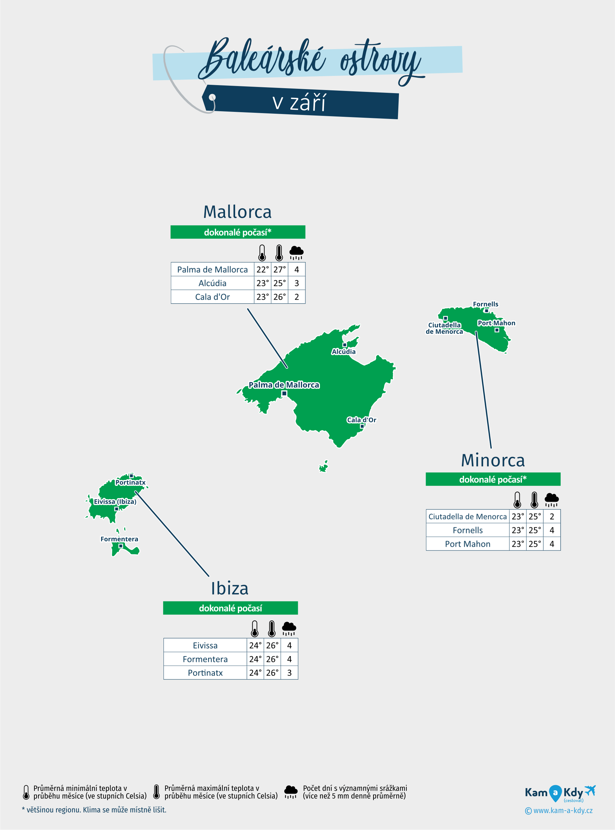 | Ibiza (Eivissa (Ibiza), Formentera, Portinatx...) | 79°F | 3 à 4 dní | 79°F | dokonalé počasí |