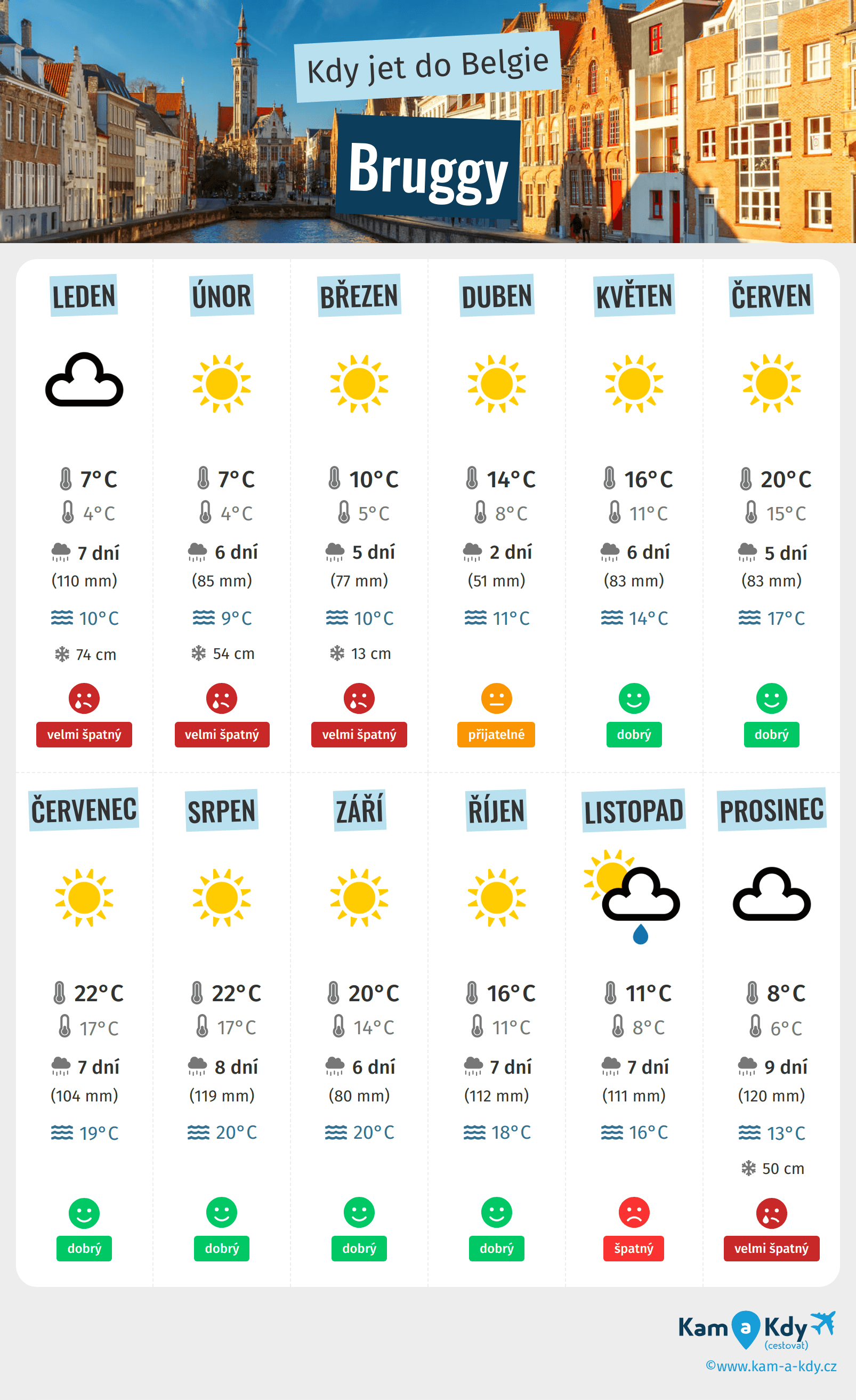 - Nejlepší měsíce pro dobré počasí v Bruggách jsou Květen, červen, červenec, Srpen, Září a říjen