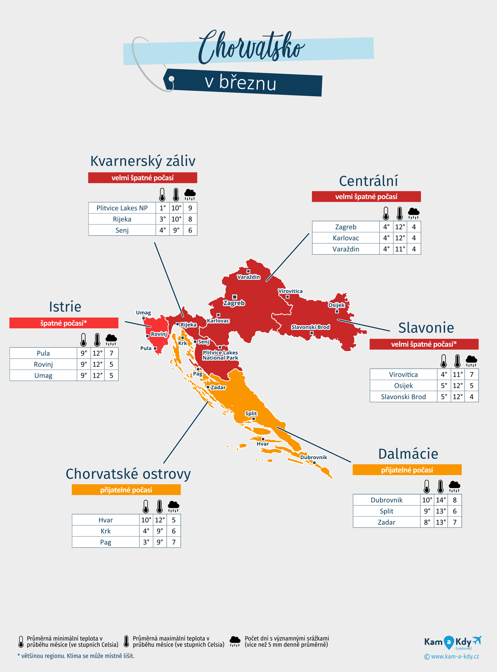 Klima v Chorvatsku v březnu je přijatelné až velmi špatný v závislosti na oblasti a městu.