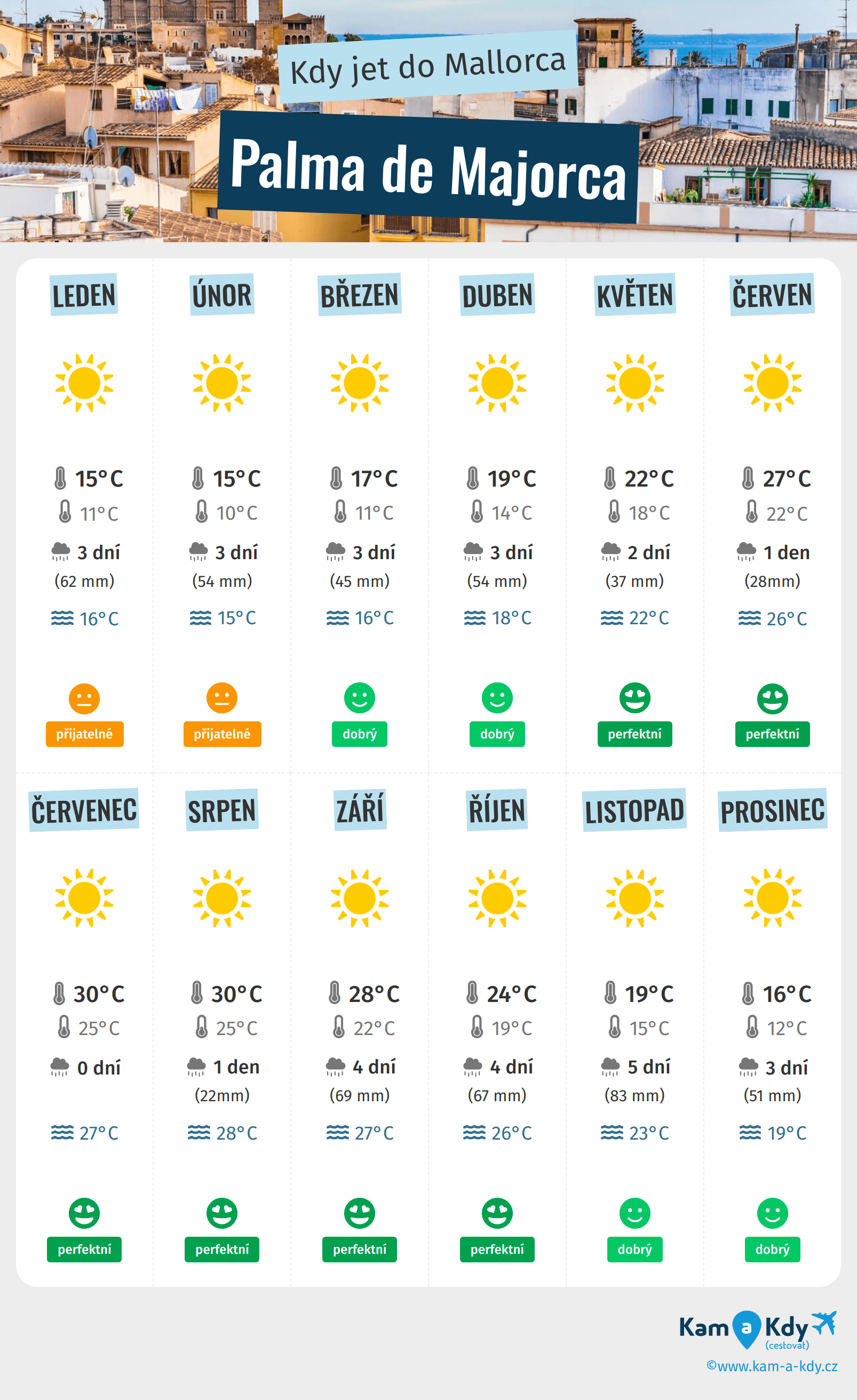 - Nejlepší měsíce pro dobré počasí v Palma de Majorca jsou Březen, Duben, Květen, červen, červenec, Srpen, Září, říjen, Listopad a Prosinec