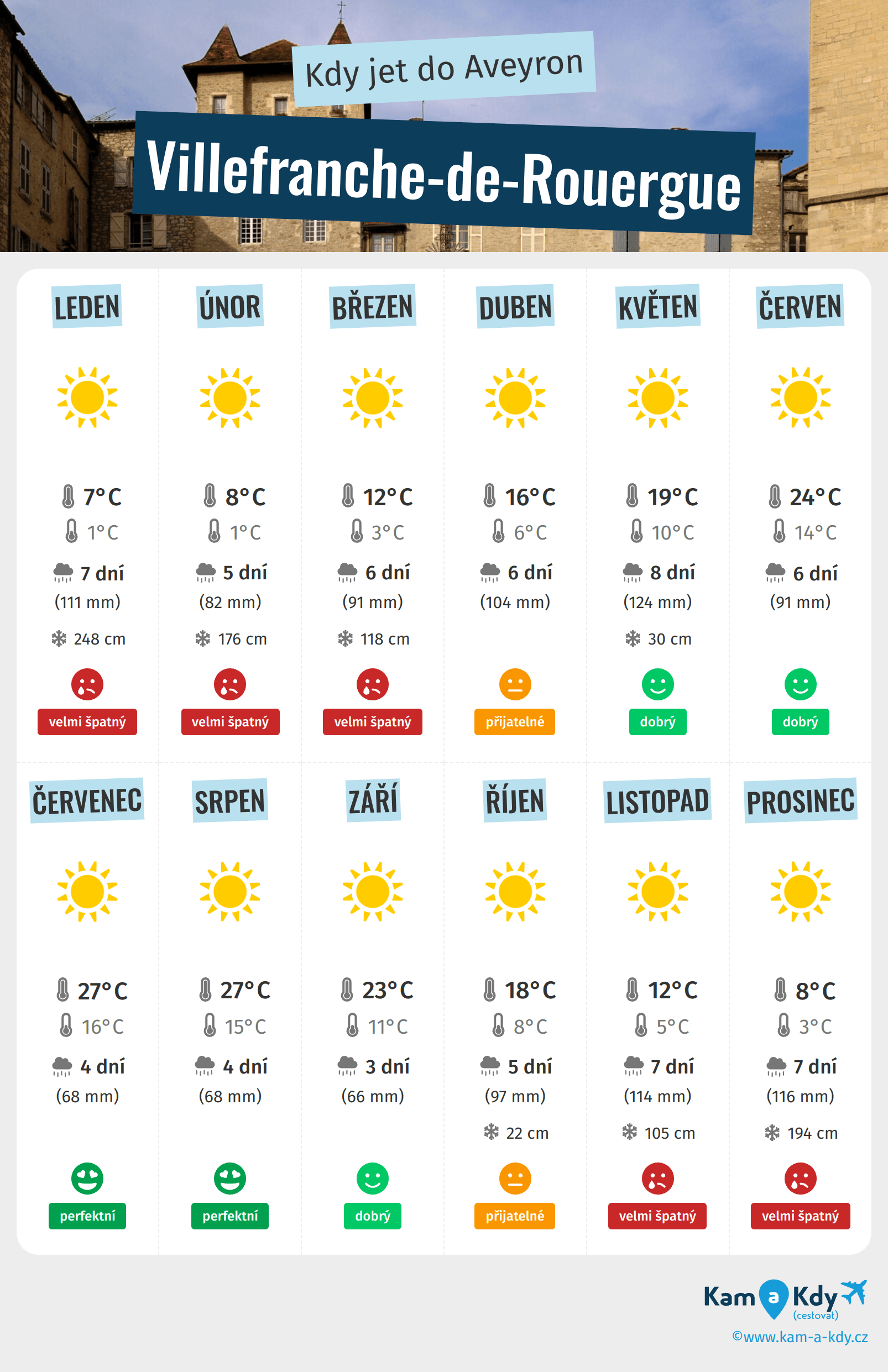 - Nejlepší měsíce pro dobré počasí v Villefranche-de-Rouergue jsou Květen, červen, červenec, Srpen a Září