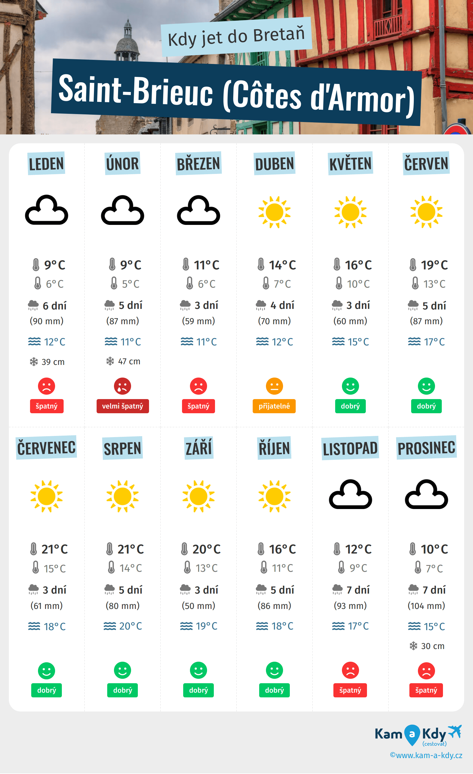 Kdy je nejlepší časpro cestu do Saint-Brieuc (Côtes d'Armor)? Zde je několik informací, které vám pomohou při rozhodování: