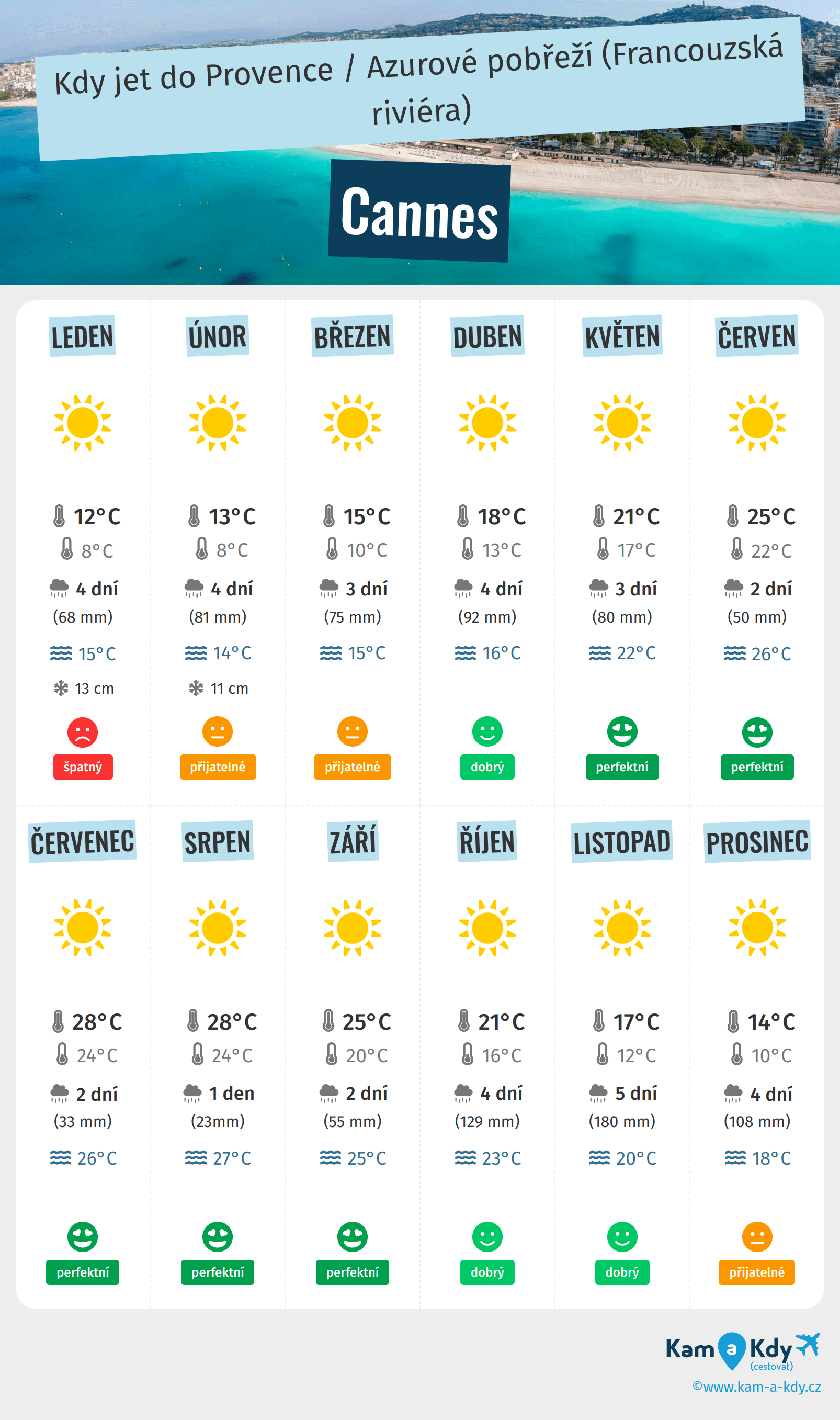 Podrobnosti o počasí v Cannes měsíc po měsíci