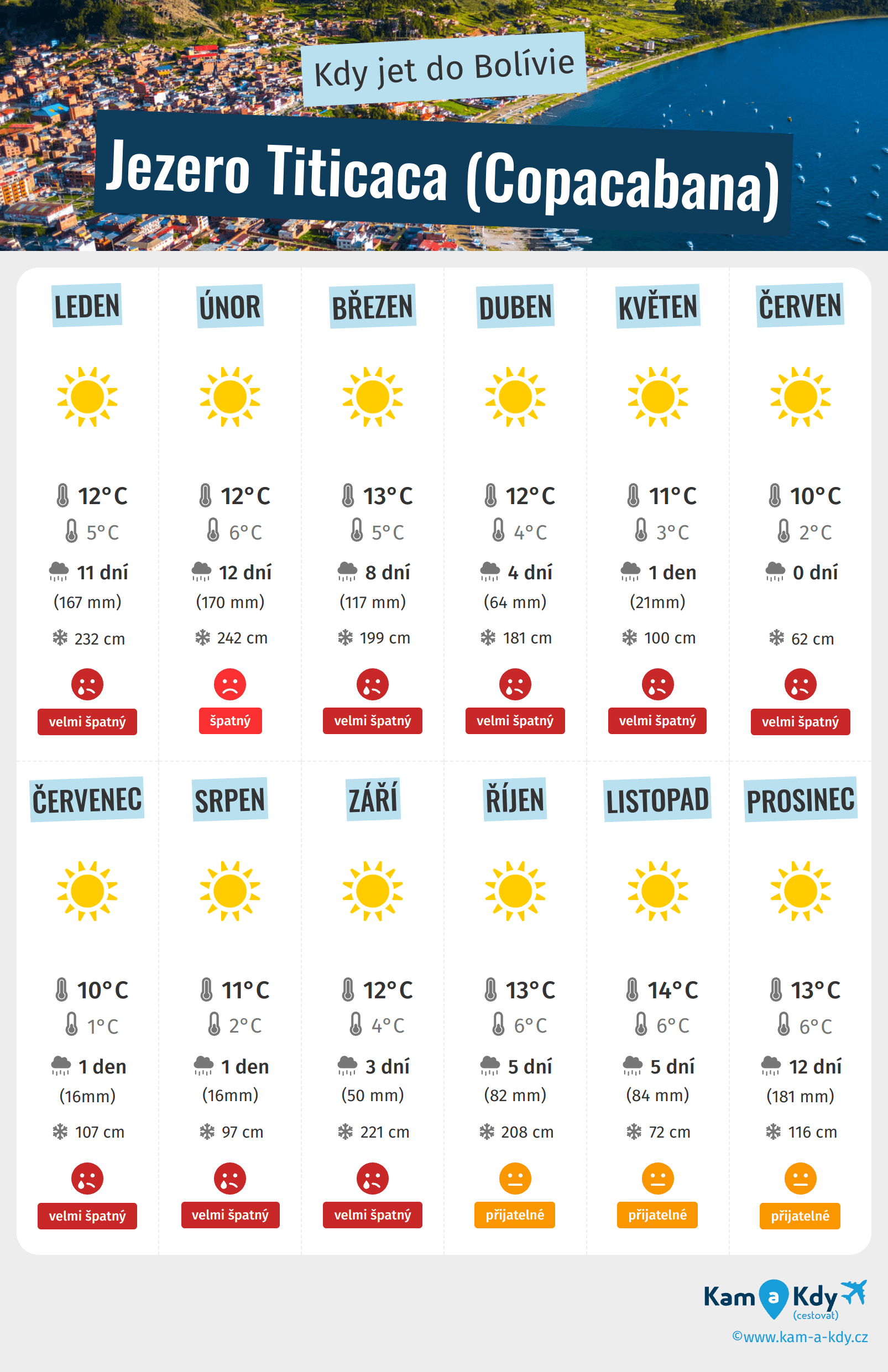 - Nejlepší měsíce na jezeru Titicaca (Copacabana) jsou říjen, Listopad a Prosinec
