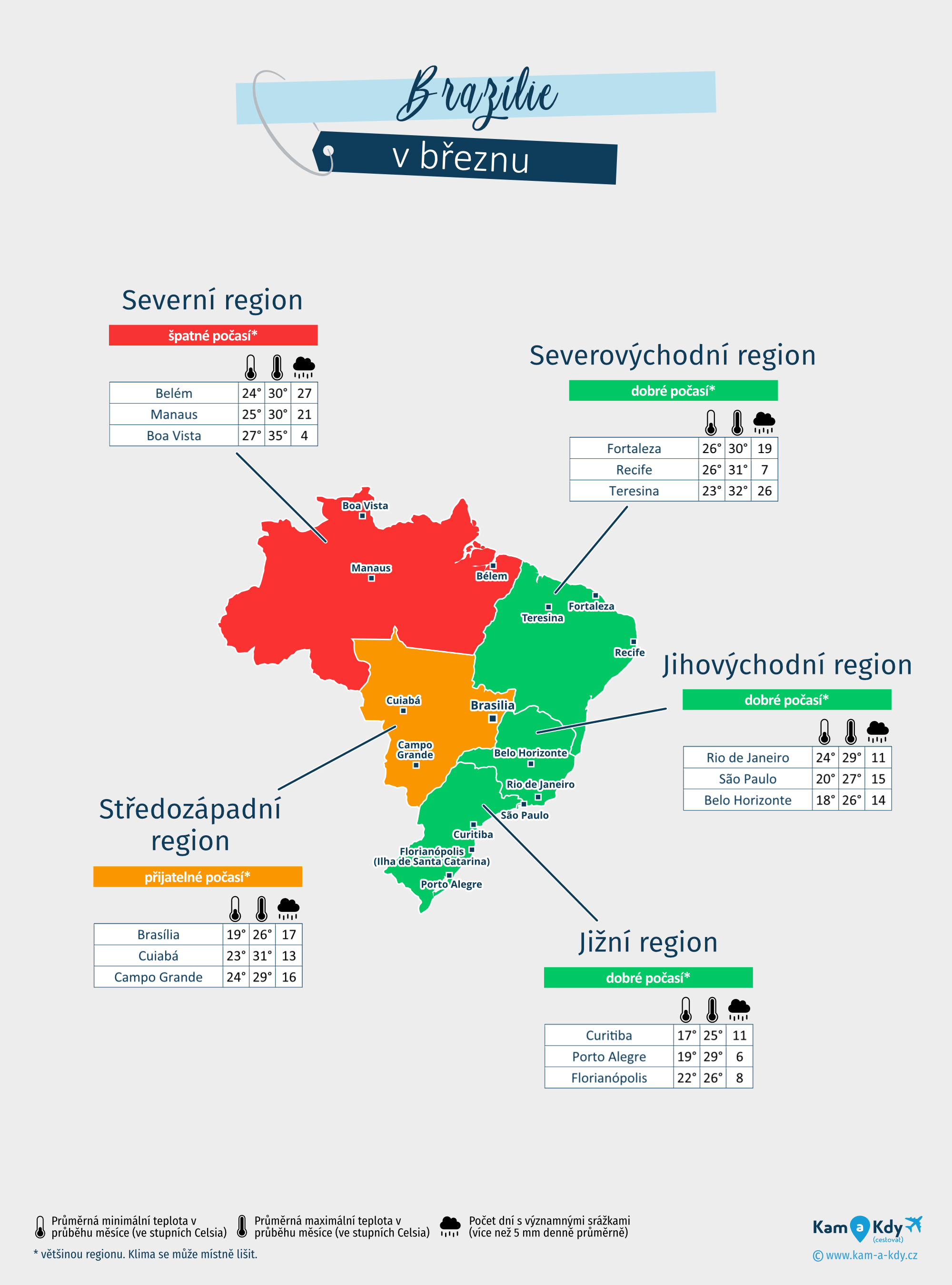 | Severní region (Belem, Manaus, Boa Vista...) | 85°F na 95°F | 4 à 27 dní | 83°F na 85°F | špatné počasí* |