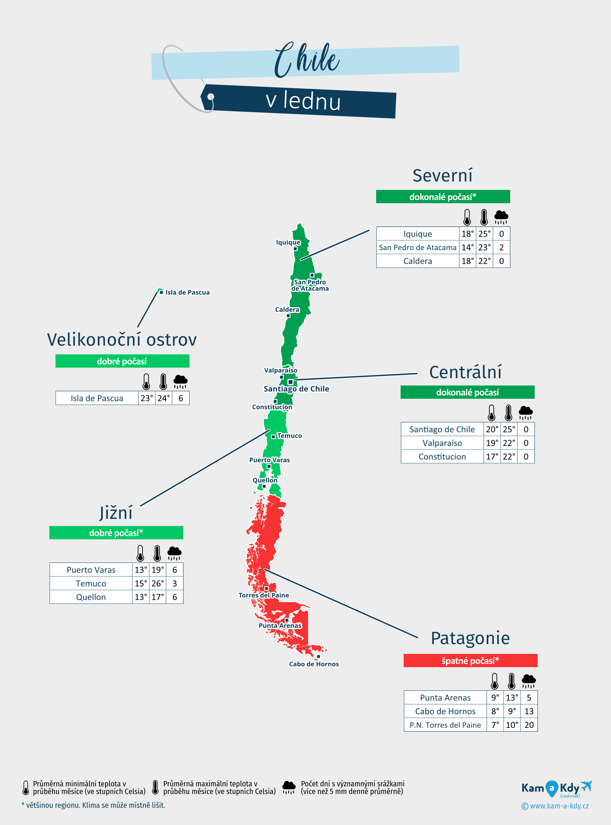 | Severní (San Pedro de Atacama (poušť Atacama), Iquique, Caldera...) | 52°F na 85°F | 0 à 16 dní | 65°F na 74°F | dokonalé počasí* |