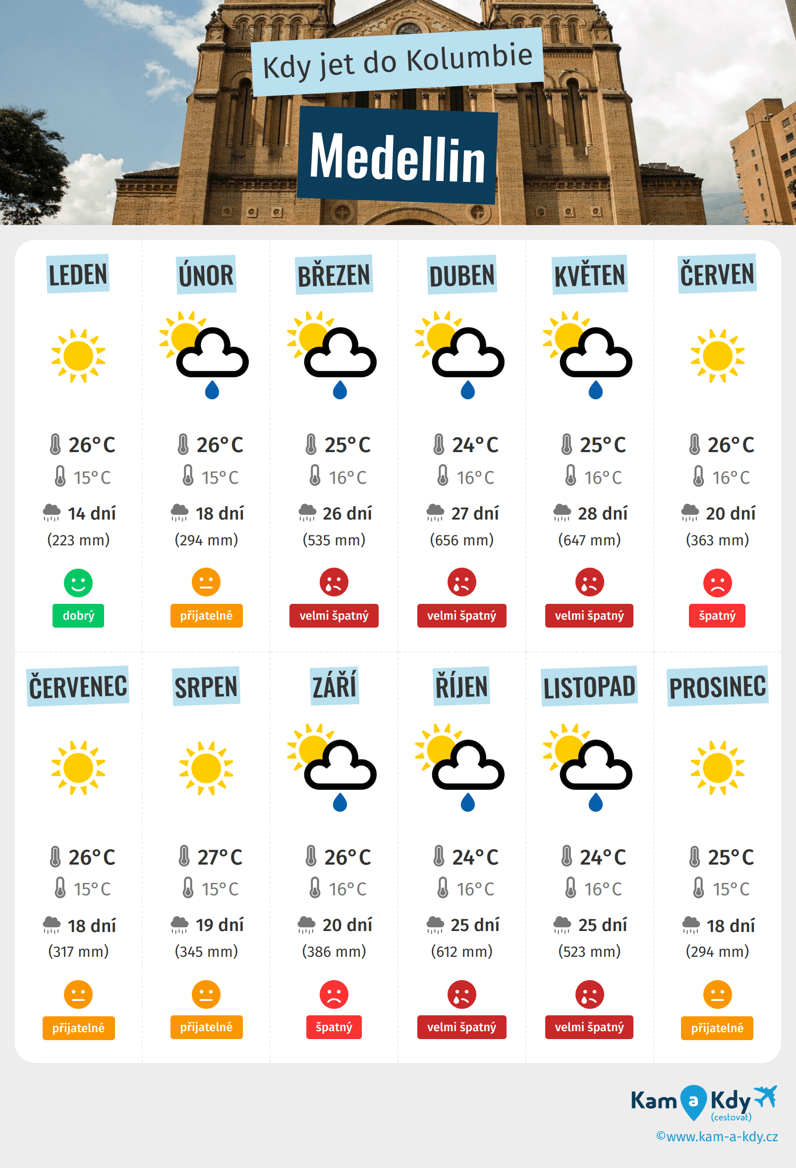 Měsíce s nízkou návštěvností jsou: únor, červenec, Září, říjen a Listopad. - Hlavní sezóna v Medellin