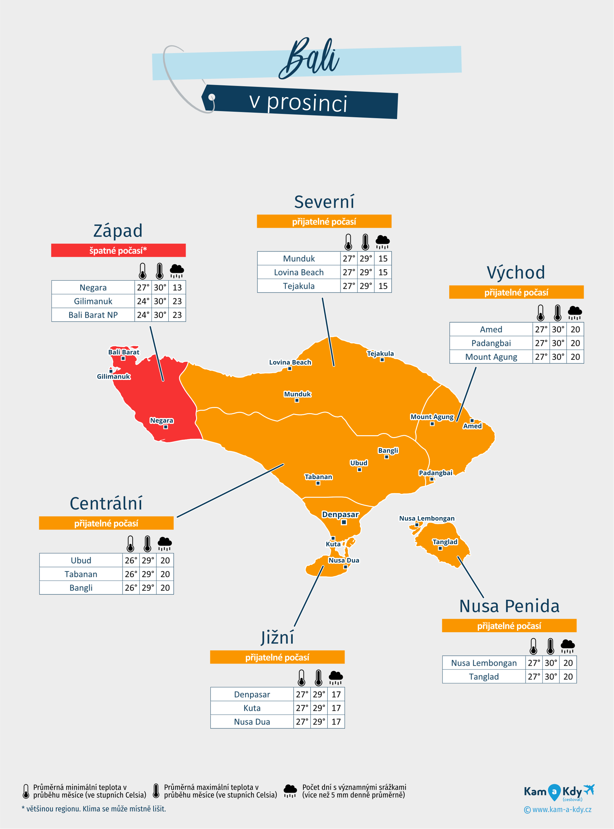 | Východ (Amed, Padangbai, Agung...) | 86°F | 20 dní | 86°F | přijatelné počasí |