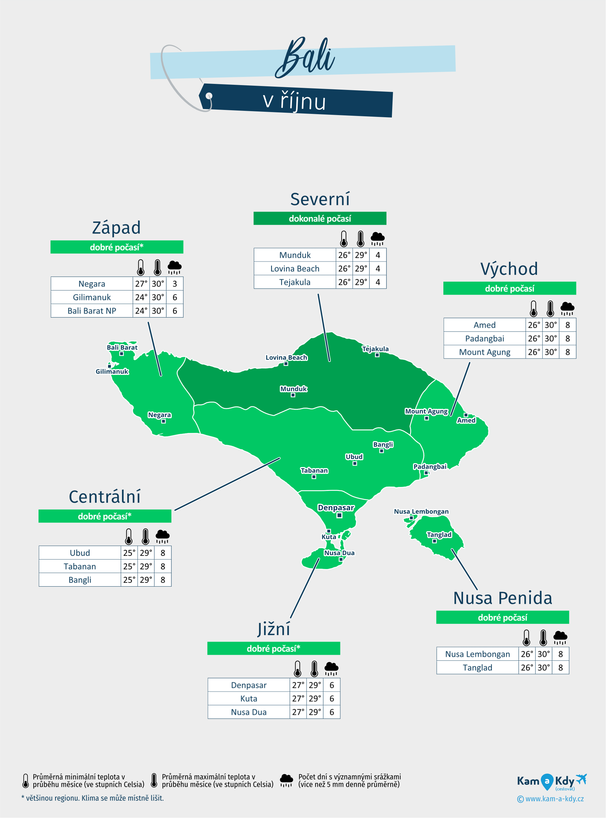 Bali: mapa počasí v říjnu v různých regionech ©kam-a-kdy.cz