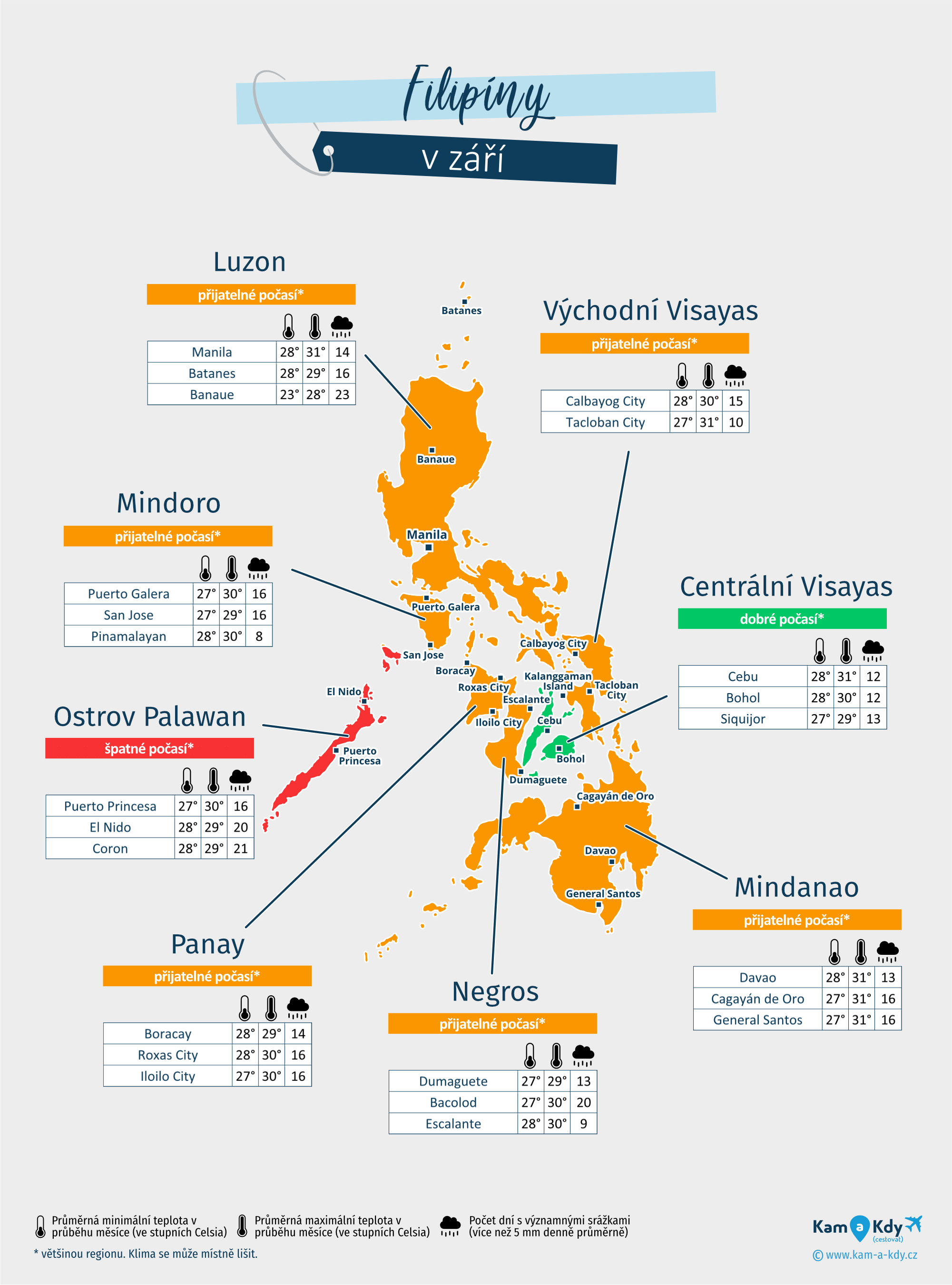 | Negros (Dumaguete, Bacolod, Escalante...) | 85°F na 88°F | 9 à 20 dní | 85°F na 86°F | přijatelné počasí* |