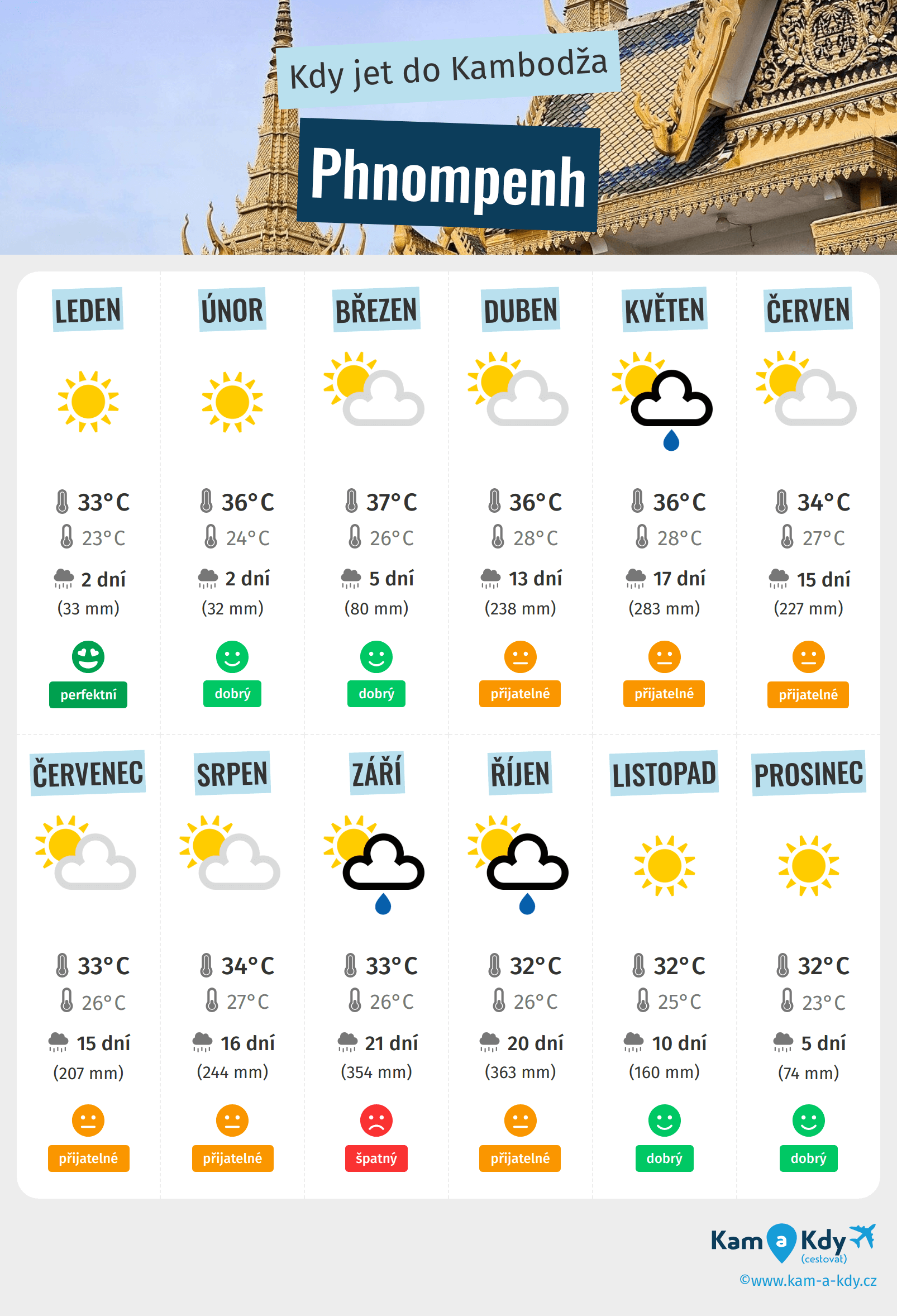 - Nejlepší měsíce pro dobré počasí v Phnompenhu jsou Leden, únor, Březen, Listopad a Prosinec