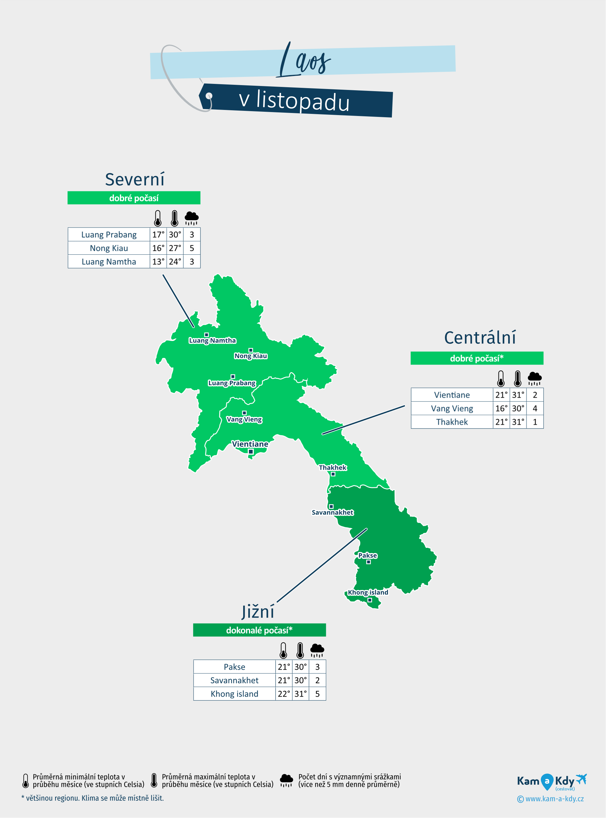 | Jižní (Pakse, Savannakhet, Ostrov Khong (Don Khong)...) | 86°F na 90°F | 2 à 5 dní | dokonalé počasí* |