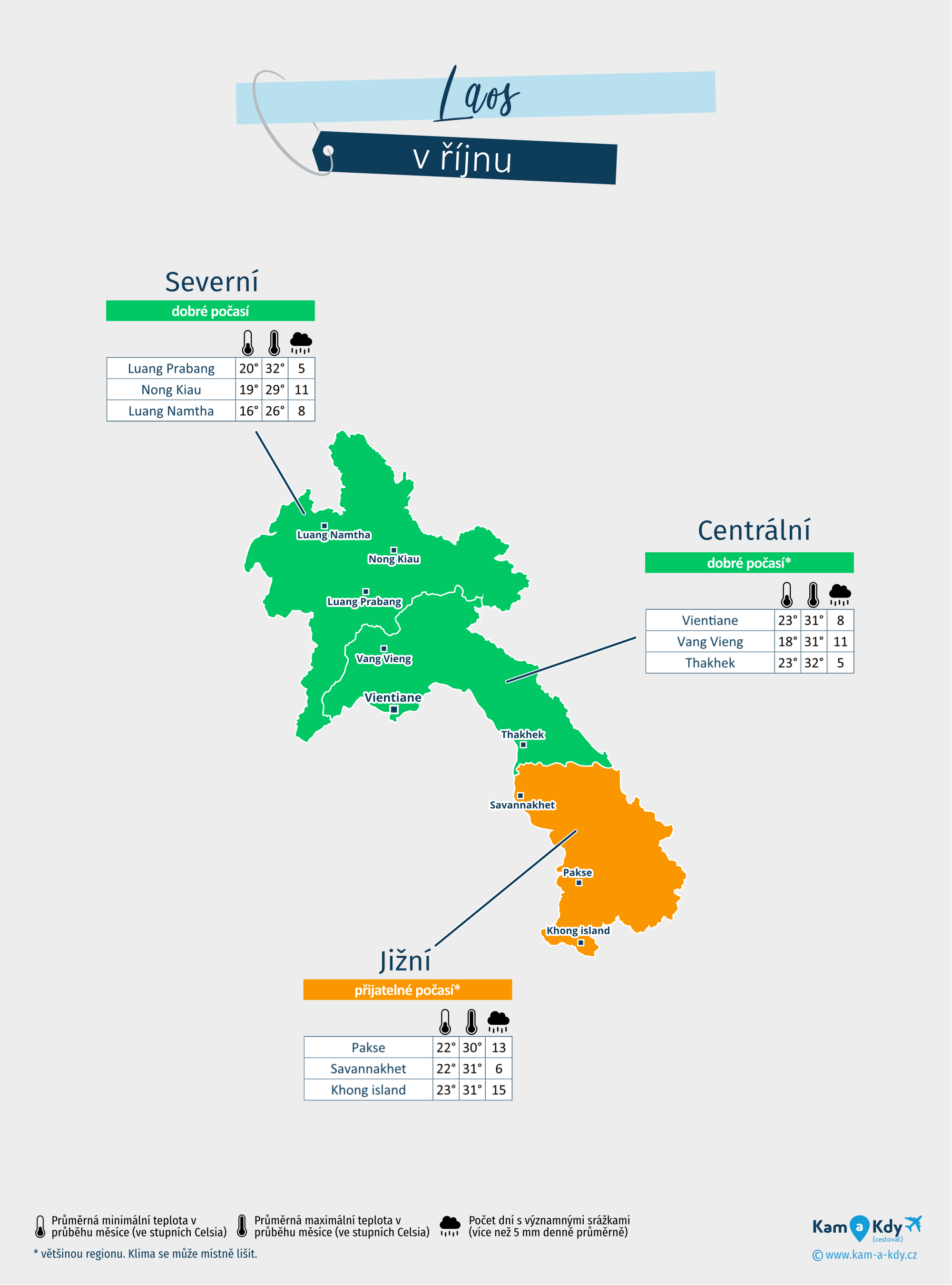 | Centrální (Vientiane, Vang Vieng, Thakhek...) | 81°F na 90°F | 5 à 11 dní | dobré počasí* |