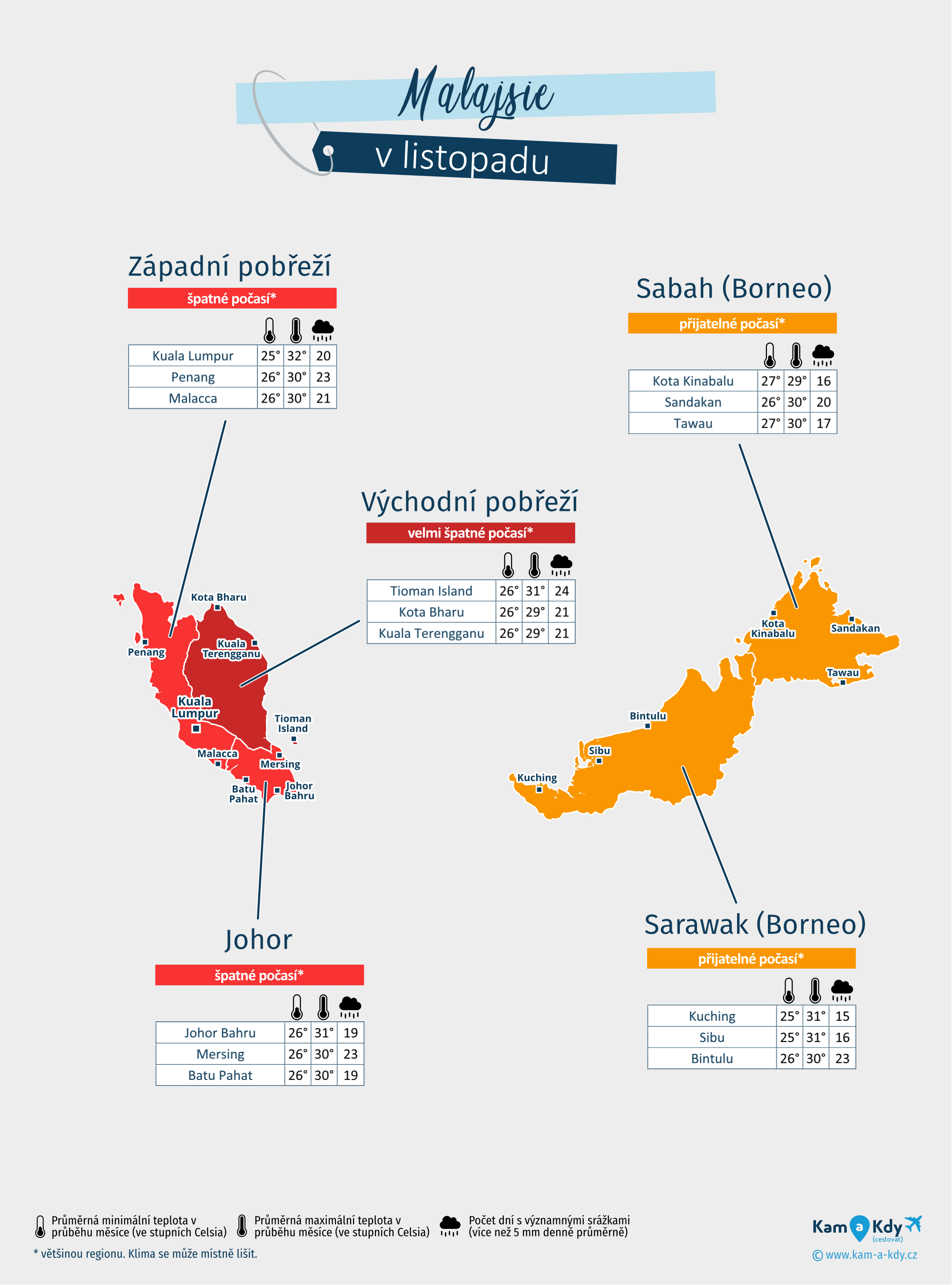 | Východní pobřeží (Ostrov Tioman, Kota Bharu, Kuala Terengganu...) | 85°F na 92°F | 16 à 27 dní | 85°F na 86°F | velmi špatné počasí* |