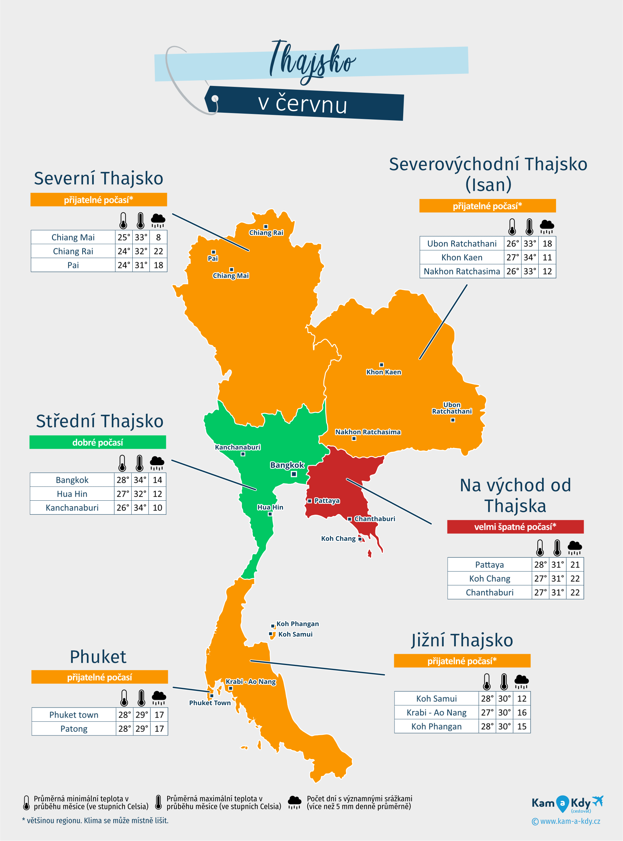 Pokud nechcete jít pro slunce a modrou oblohu, ale, například jít za poznáním okolí, města Národní park Khao Lak, Koh Phi Phi, Si Racha, Phetchaburi, Udon Thani, Loei, Amnat Charoen, Saraburi, Koh Lanta, Lopburi, Si Sa Ket, Maha Sarakham, Sattahip, Pran Buri, Phichit, Národní park Khao Sok, Betong, Khemarat, Ban Rai, Hua Hin, Phitsanulok, Pak Chong, Sa Kaeo, Nakhon Sawan, Hat Yai, Suphan Buri, Sukhothai, Tak, Phayao, Kamphaeng Phet, Pattaya, Chaiyaphum, Phetchabun, Surat Thani, Nong Khai, Mukdahan, Pong, Klaeng, Rayong, Nan, Národní park Khao Yai, Mae Hong Son, Chon Buri, Roi Et, Phrae, Ayutthaya, Ratchaburi, Uthai Thani, Ko Samet, Chumphon, Prachuap Khiri Khan, Bangkok, Yala, Nakhon Ratchasima, Nakhon Si Thammarat, Chachoengsao, Uttaradit, Chanthaburi, Phuket, Krabi - Ao Nang, Lampang, Samut Songkhram, Chiang Mai, Koh Chang, Ubon Ratchathani (Isan), Pai, Burinam, Nong Bua Lamphu, Chiang Rai, Ranong, Cha-am, Trat, Prachin Buri, Nakhon Pathom, Bueng Kan, Surin, Chawang, Kalasin, Bang Lamung, Lamphun, Yasothon, Ban Khok, Sakhon Nakhon a Khon Kaen mají OK, ale přijatelné počasí pro tamto v červen. Nakonec, vyhnout se ve městech Ko Lipe, Narathiwat, Koh Tao, Koh Phangan, Satun, Nakhon Phanom, Ko Samui, Mae Sot, Songkhla a Pattani ten měsíc protože klima je hezké nepříznivé.