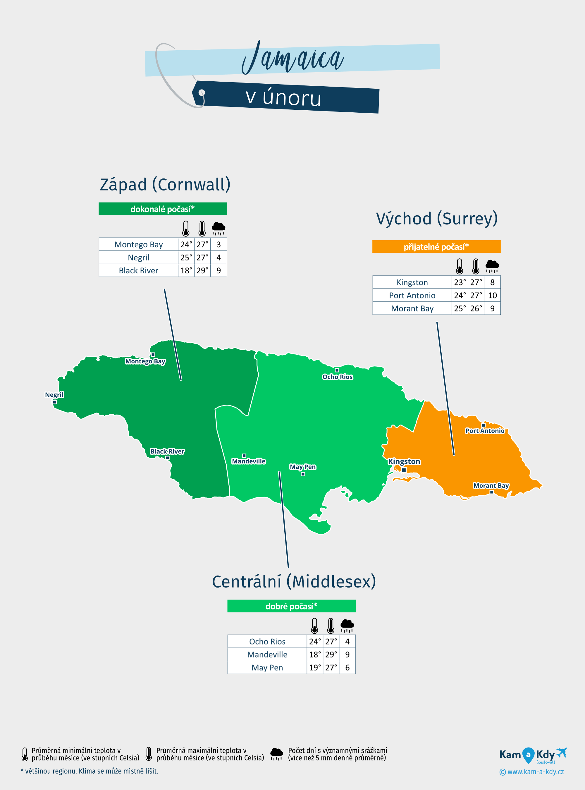 Klima na Jamajce v únoru je perfektní až přijatelné v závislosti na oblasti a městu.