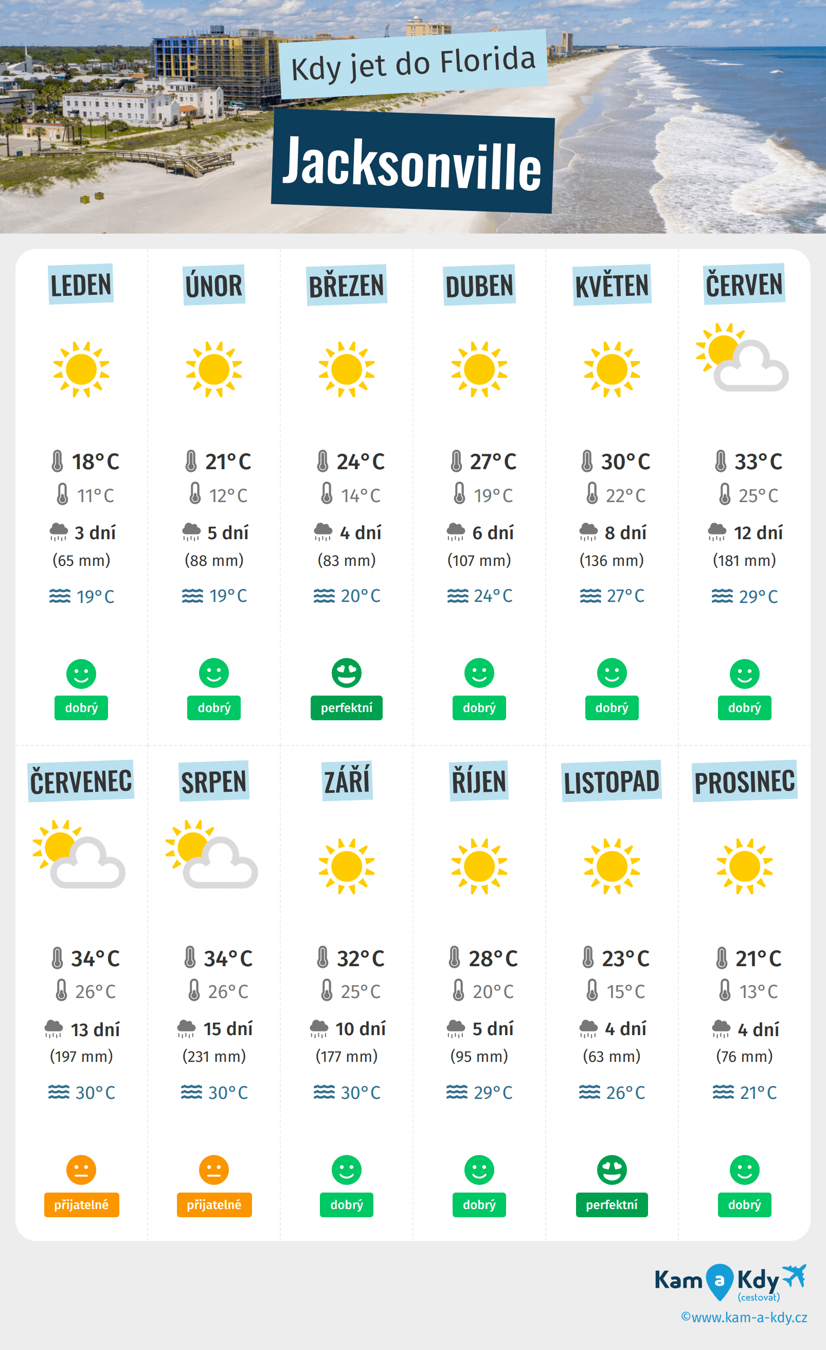 - Nejlepší měsíce pro dobré počasí v Jacksonville jsou Leden, únor, Březen, Duben, Květen, červen, Září, říjen, Listopad a Prosinec