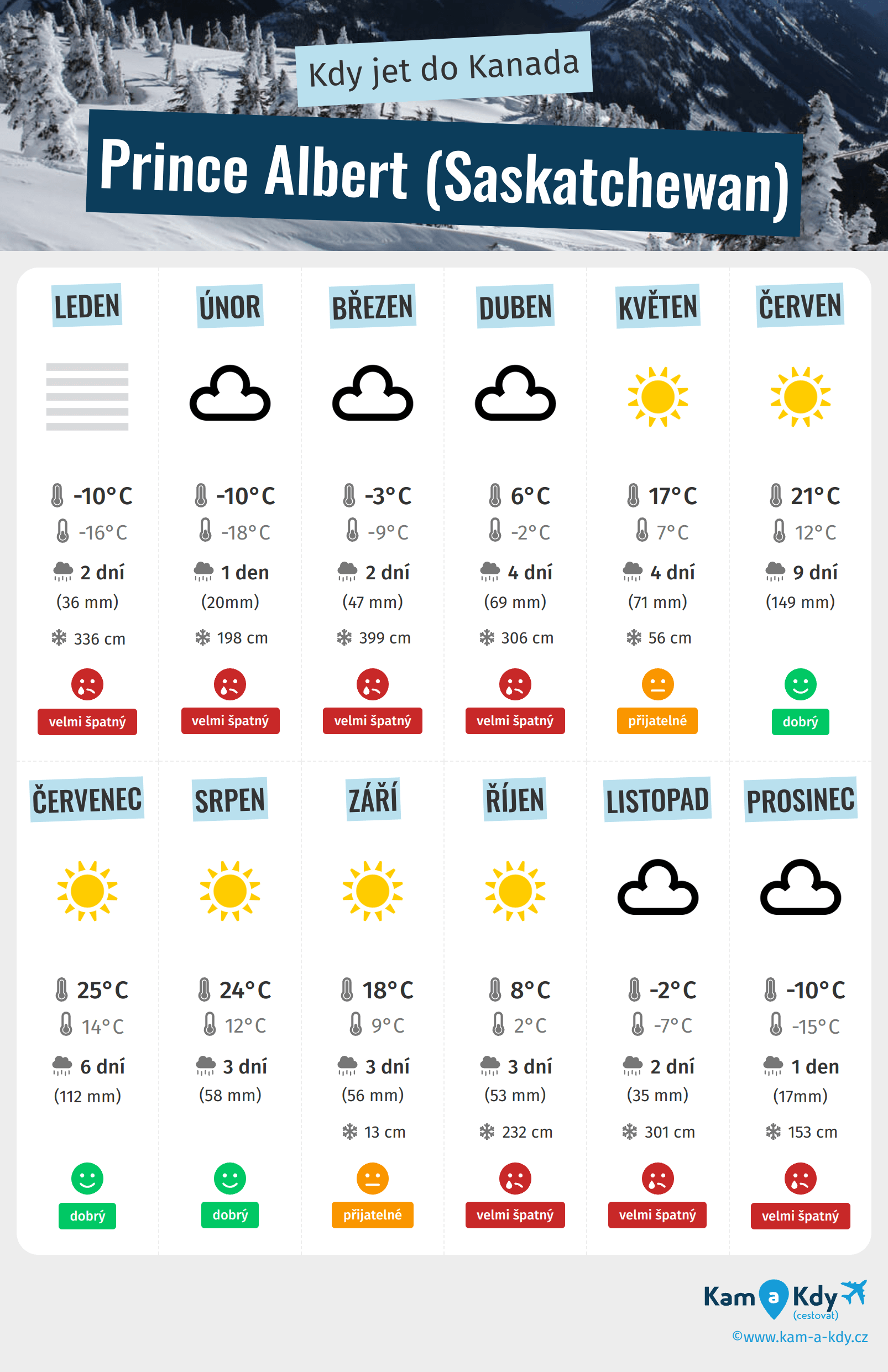 - Nejlepší měsíce pro dobré počasí v Prince Albert (Saskatchewan) jsou červen, červenec a Srpen
