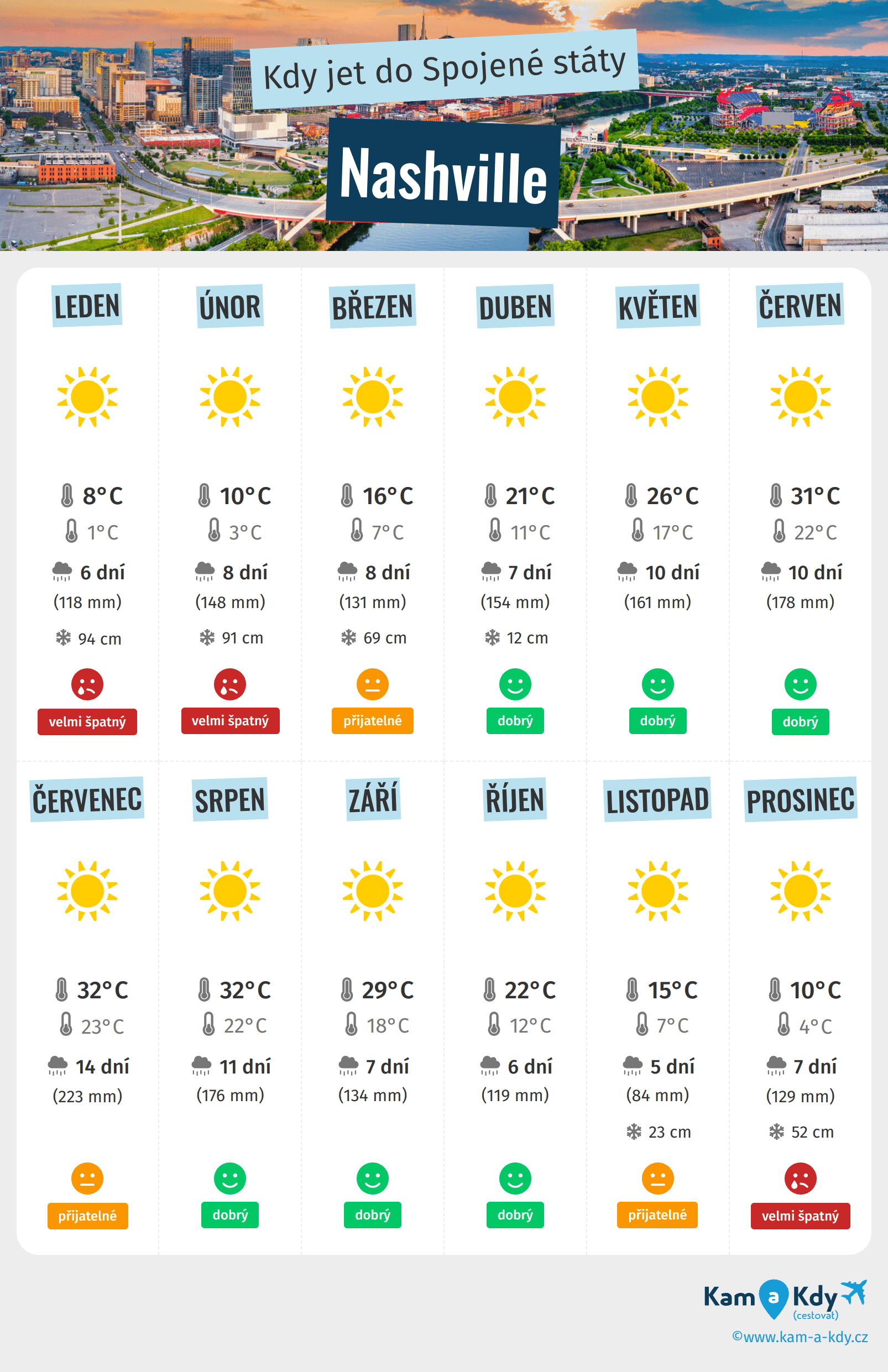 Podrobnosti o počasí v Nashvillu měsíc po měsíci