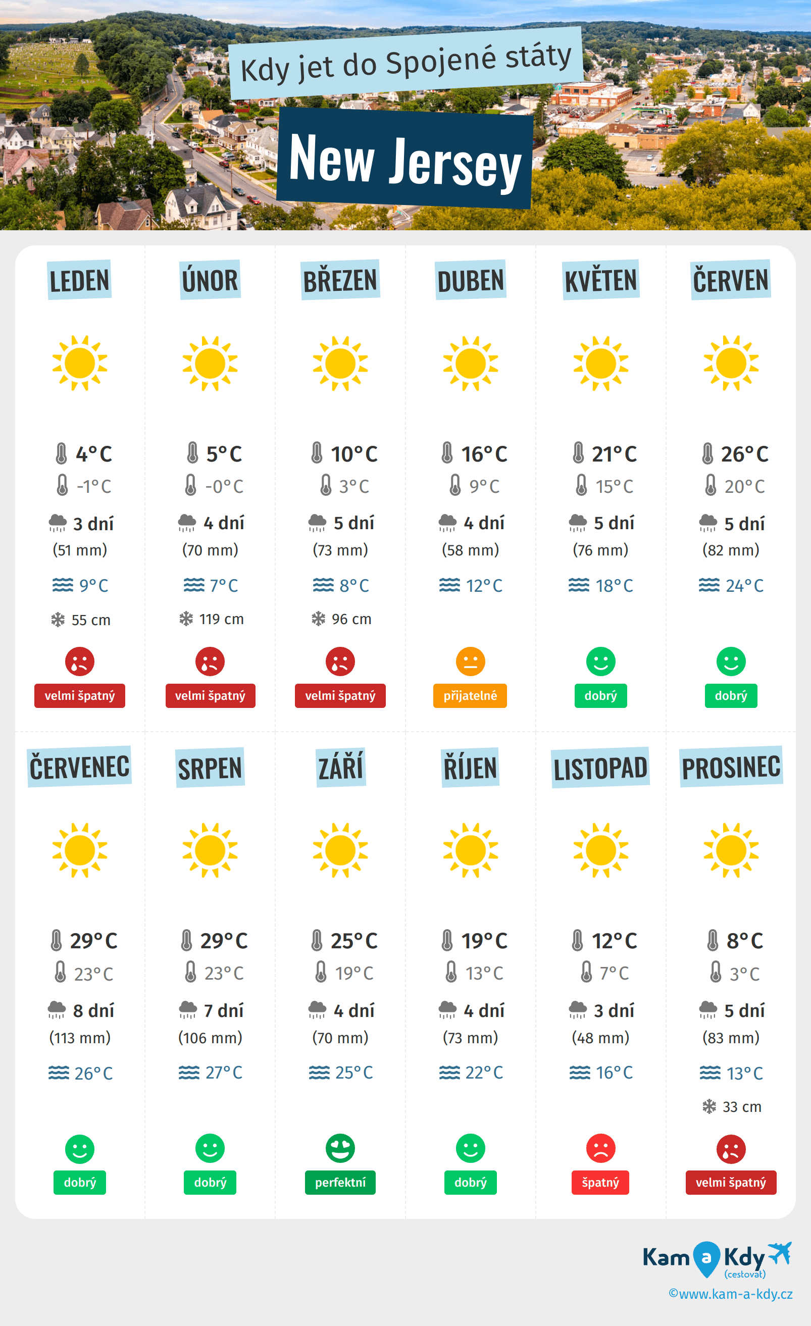 - Nejlepší měsíce pro dobré počasí v New Jersey jsou Květen, červen, červenec, Srpen, Září a říjen