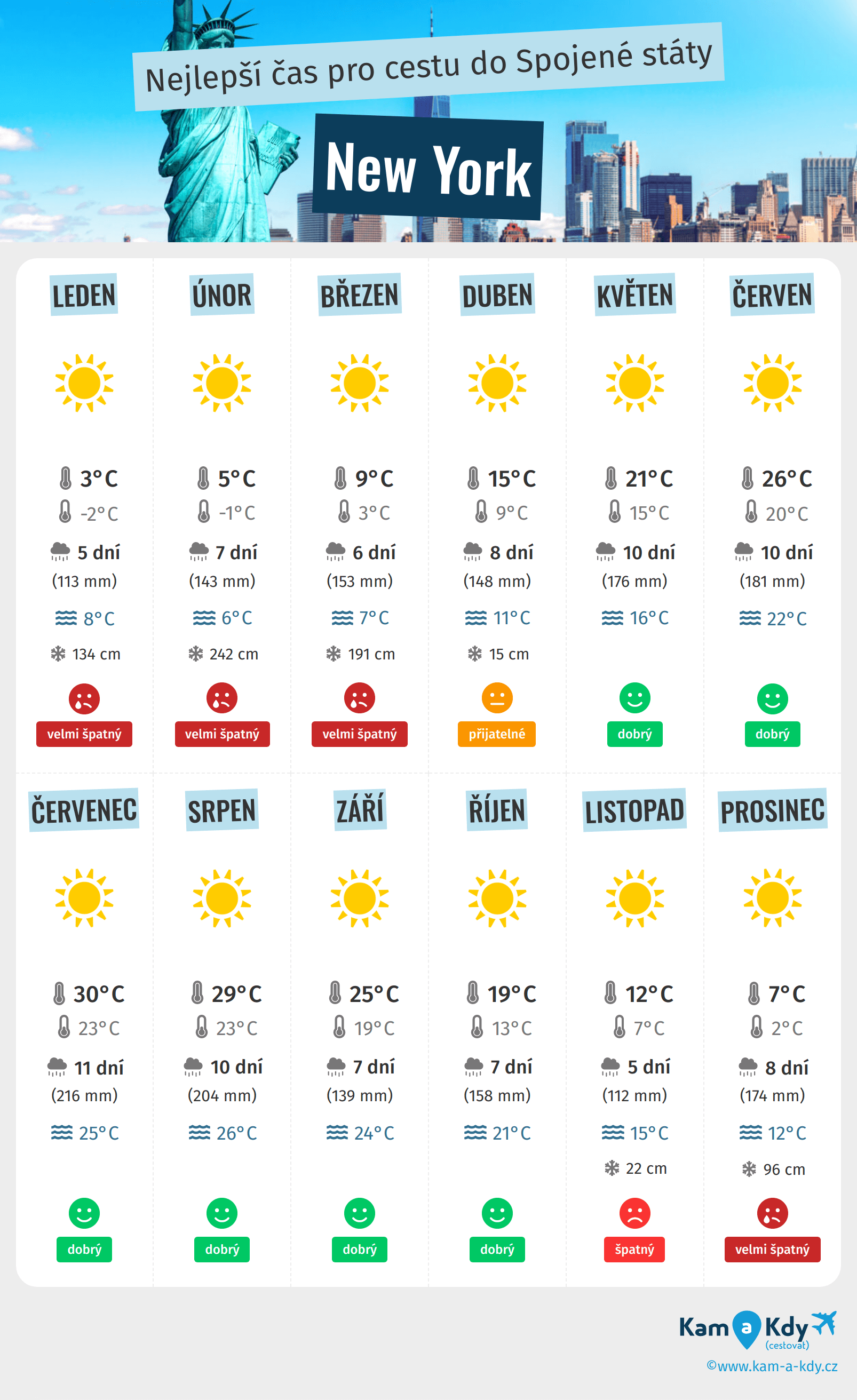 - Nejlepší měsíce pro dobré počasí v New Yorku jsou Květen, červen, červenec, Srpen, Září a říjen