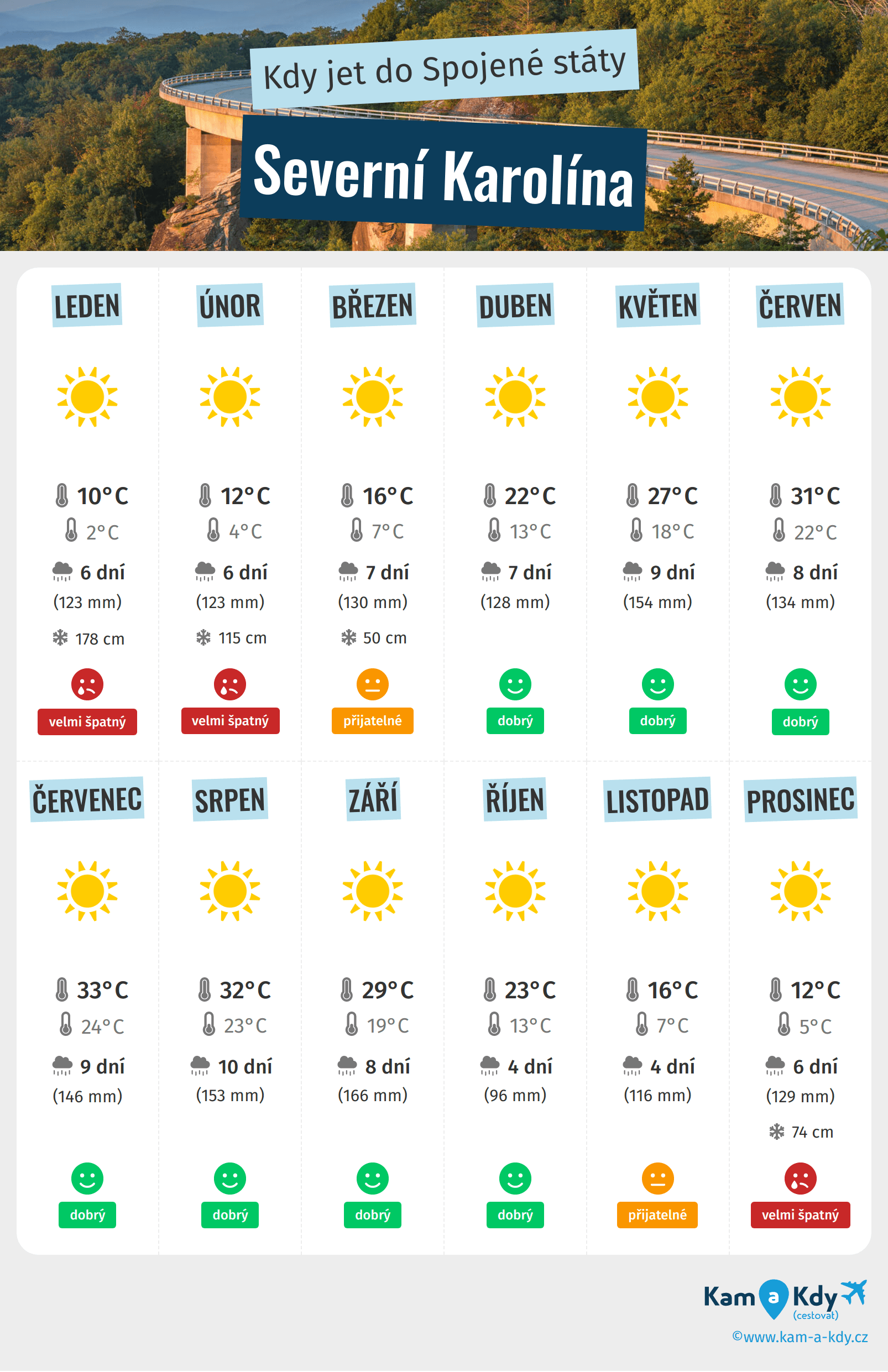 Podrobnosti o počasí v Severní Karolíně měsíc po měsíci
