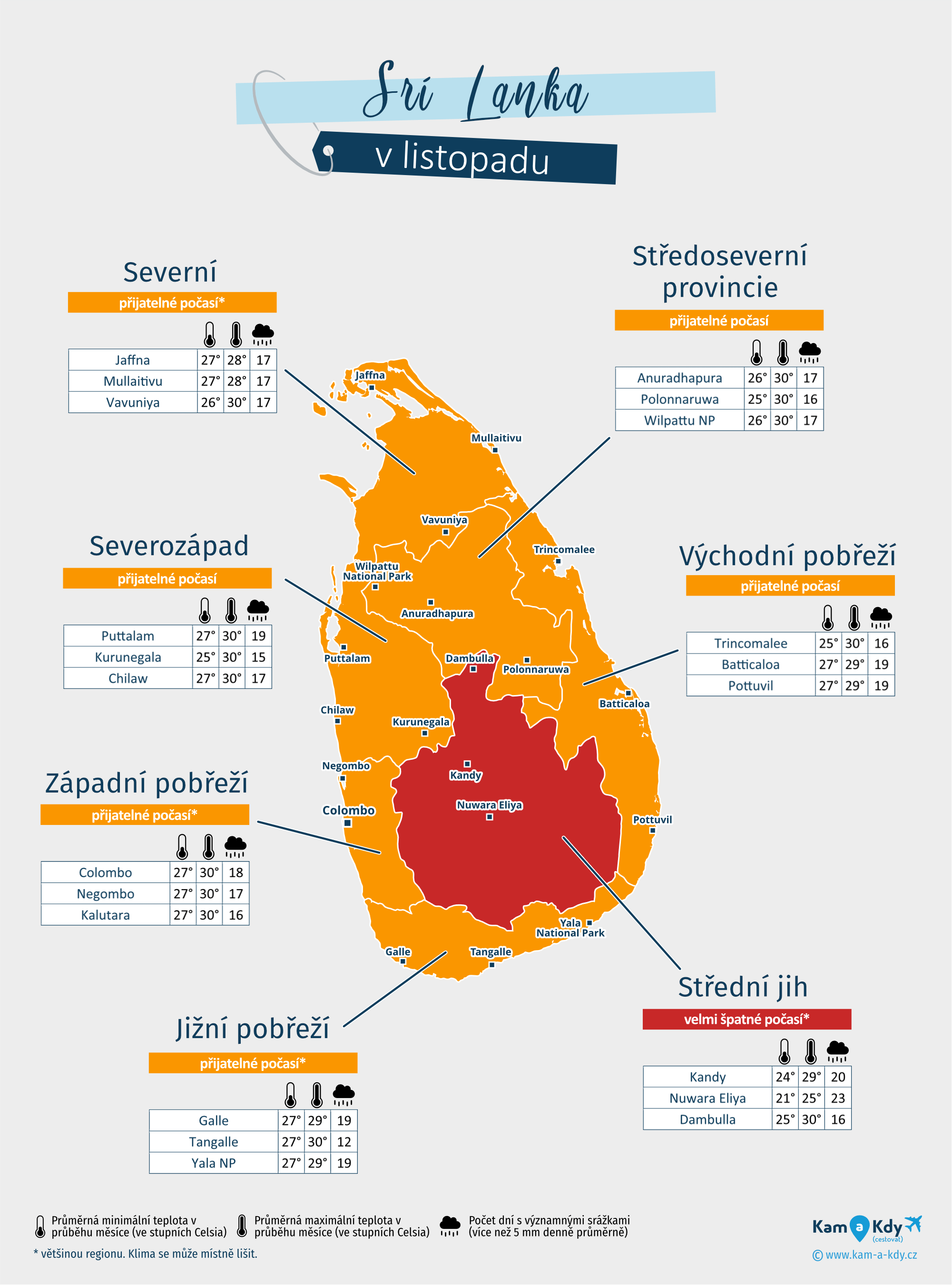 | Severozápad (Puttalam, Kurunegala, Chilaw...) | 86°F na 88°F | 15 à 19 dní | 85°F | přijatelné počasí |