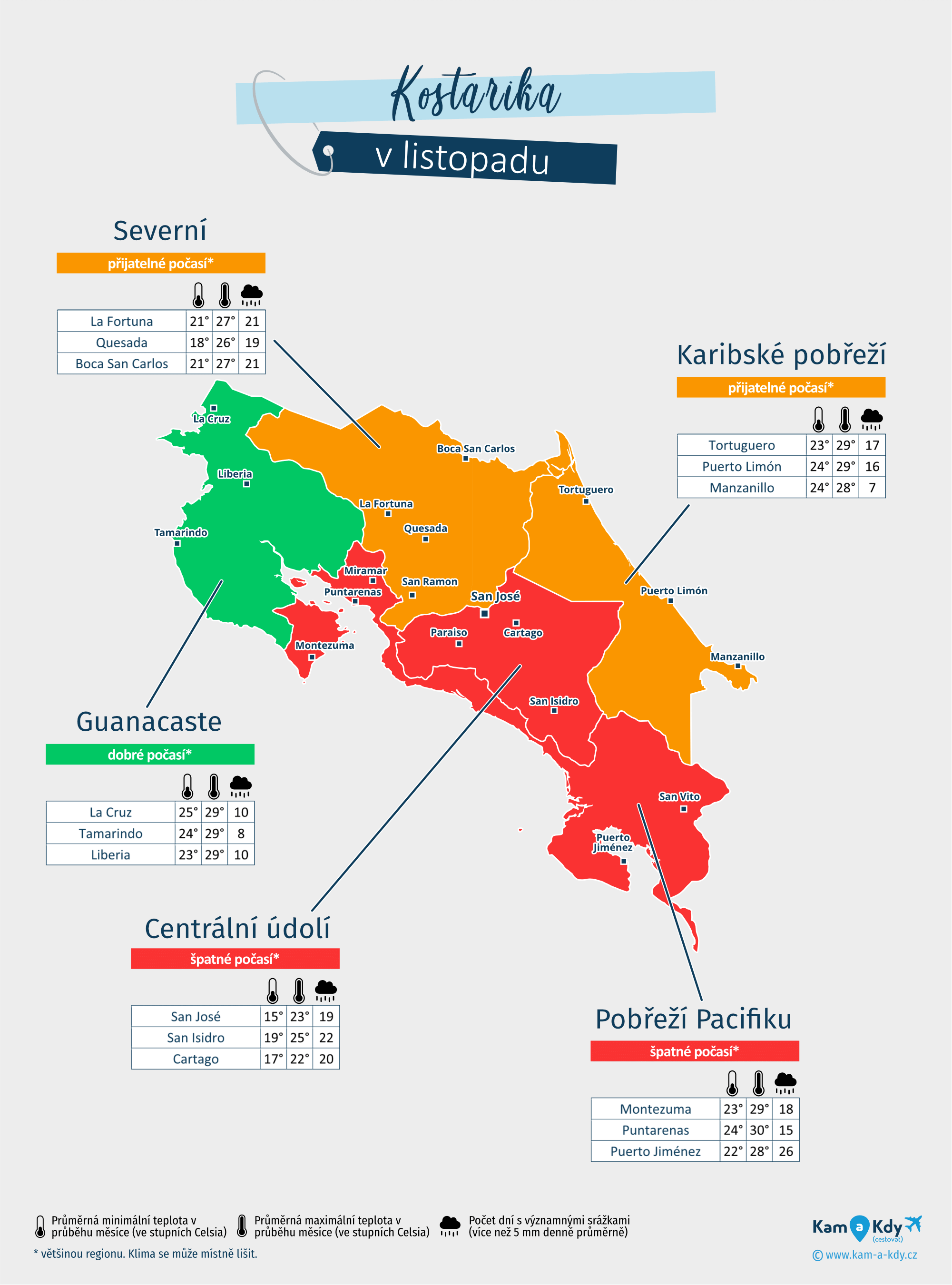 Klima v Kostarice v listopadu je dobrý až špatný v závislosti na oblasti a městu.