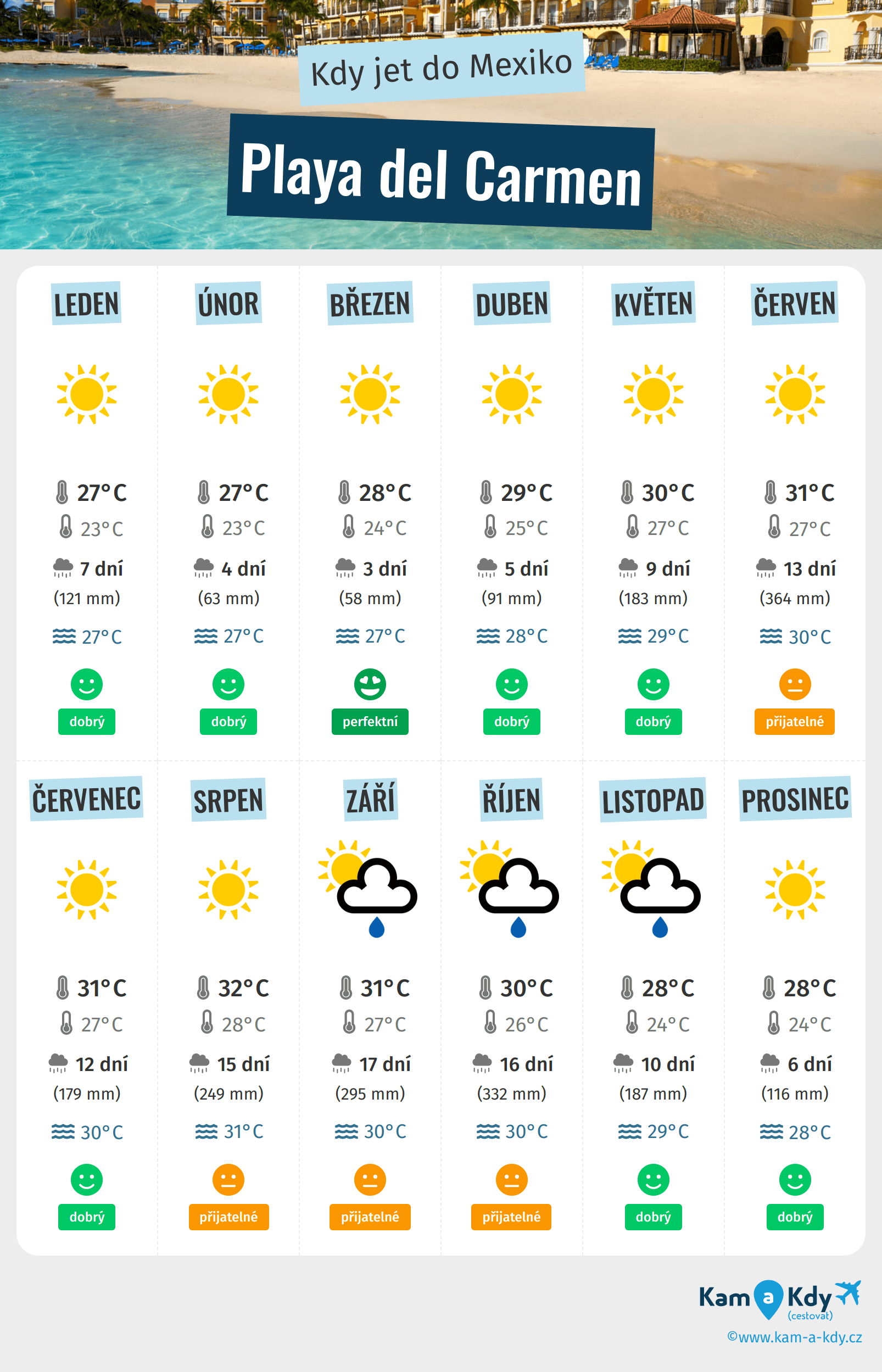Měsíce s nízkou návštěvností jsou: únor, Březen, Duben, červenec a Srpen. - Hlavní sezóna v Playa del Carmen