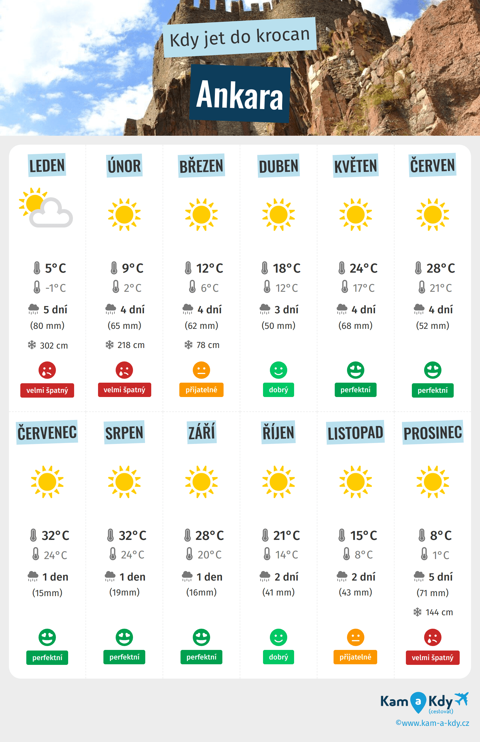- Nejlepší měsíce pro dobré počasí v Ankaře jsou Duben, Květen, červen, červenec, Srpen, Září a říjen