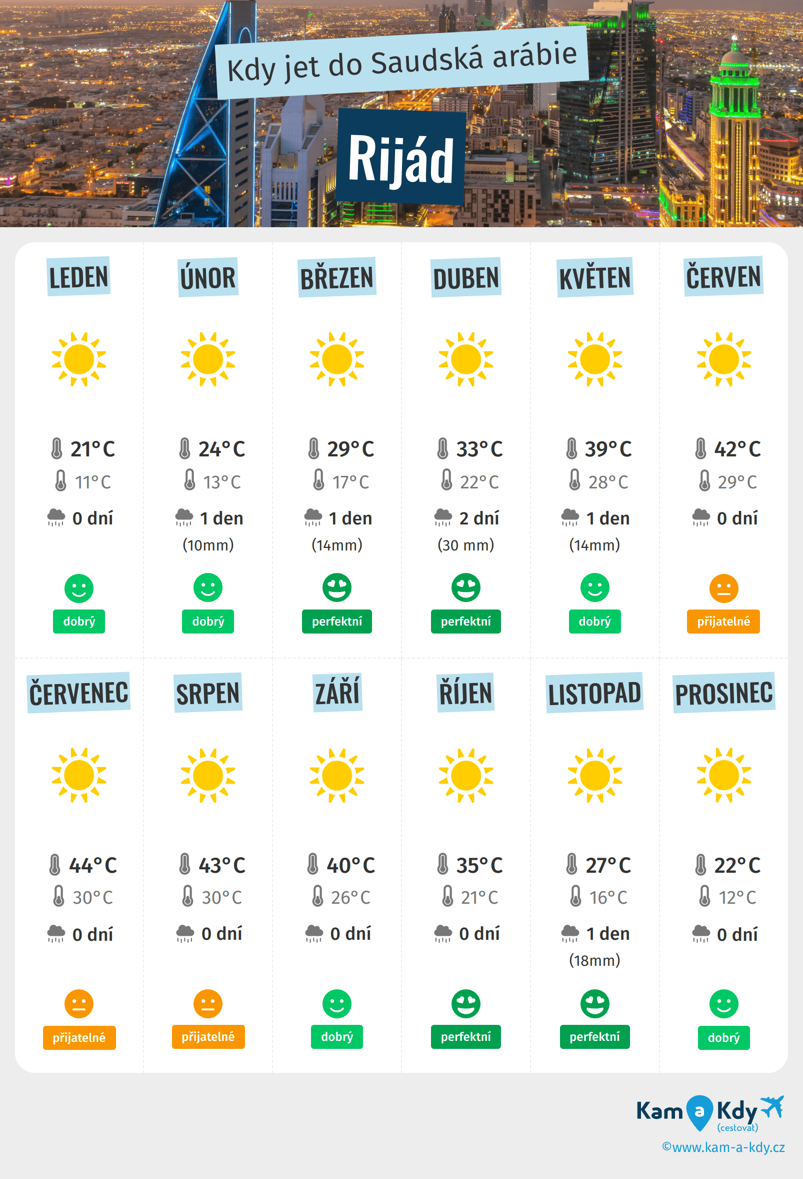 - Nejlepší měsíce pro dobré počasí v Rijádu jsou Leden, únor, Březen, Duben, Květen, Září, říjen, Listopad a Prosinec