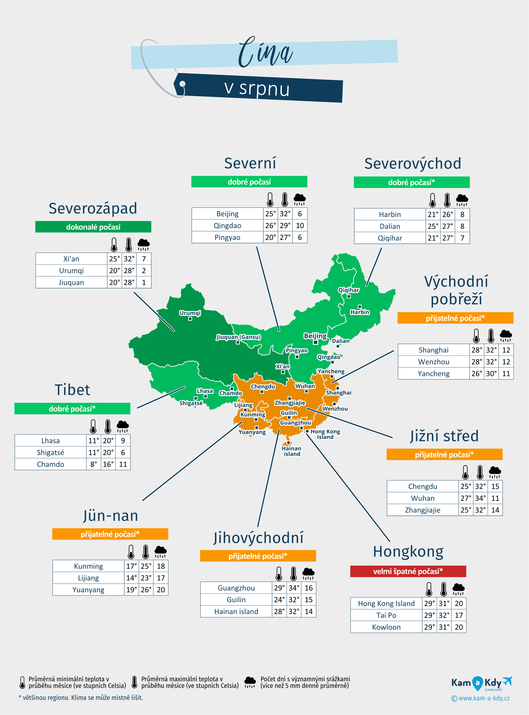 Klima v Číně v srpnu je perfektní až velmi špatný v závislosti na oblasti a městu.