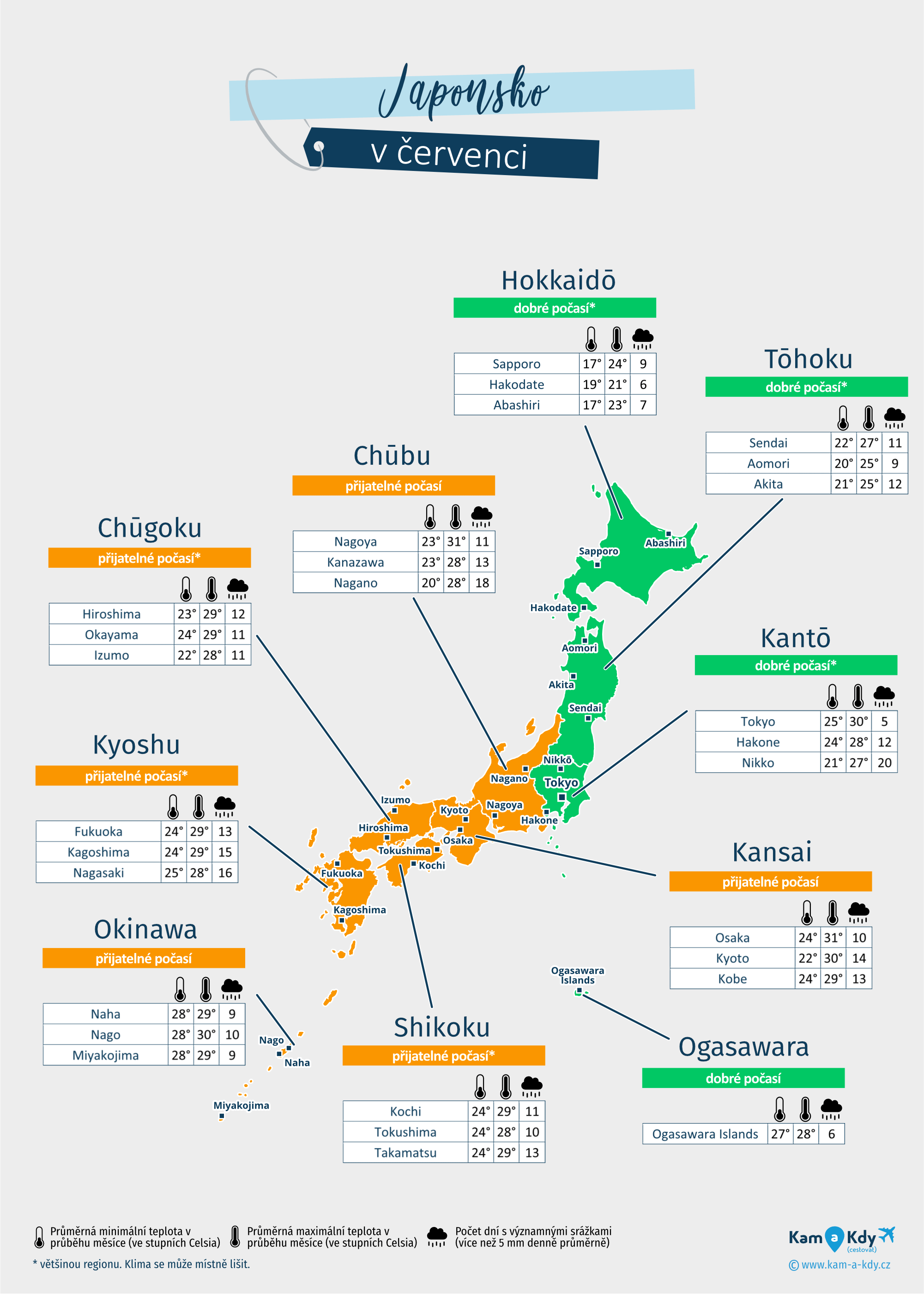 | Okinawa (Naha, Nago, Miyakojima...) | 86°F | 9 à 11 dní | 83°F na 85°F | přijatelné počasí |