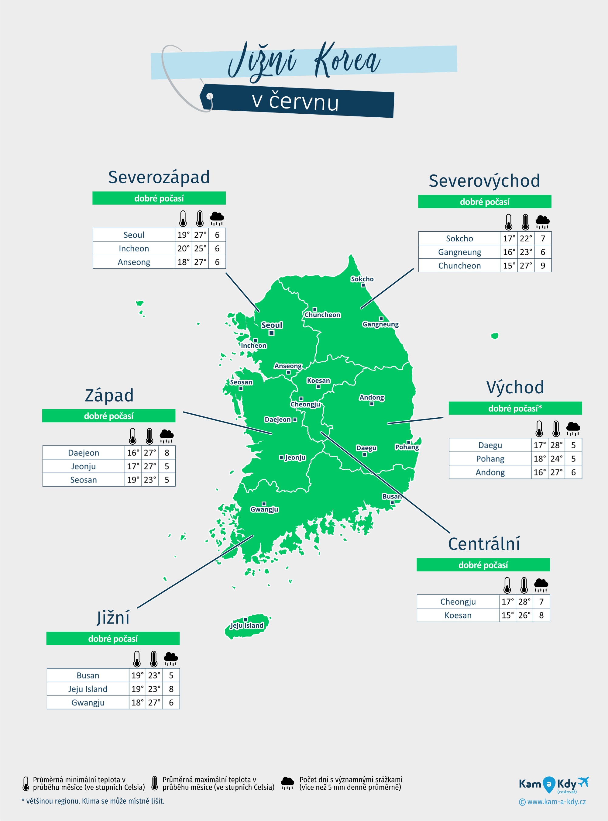 | Jižní (Pusan, Jeju Island (Jejudo), Gwangju...) | 74°F na 81°F | 5 à 8 dní | 68°F na 72°F | dobré počasí |