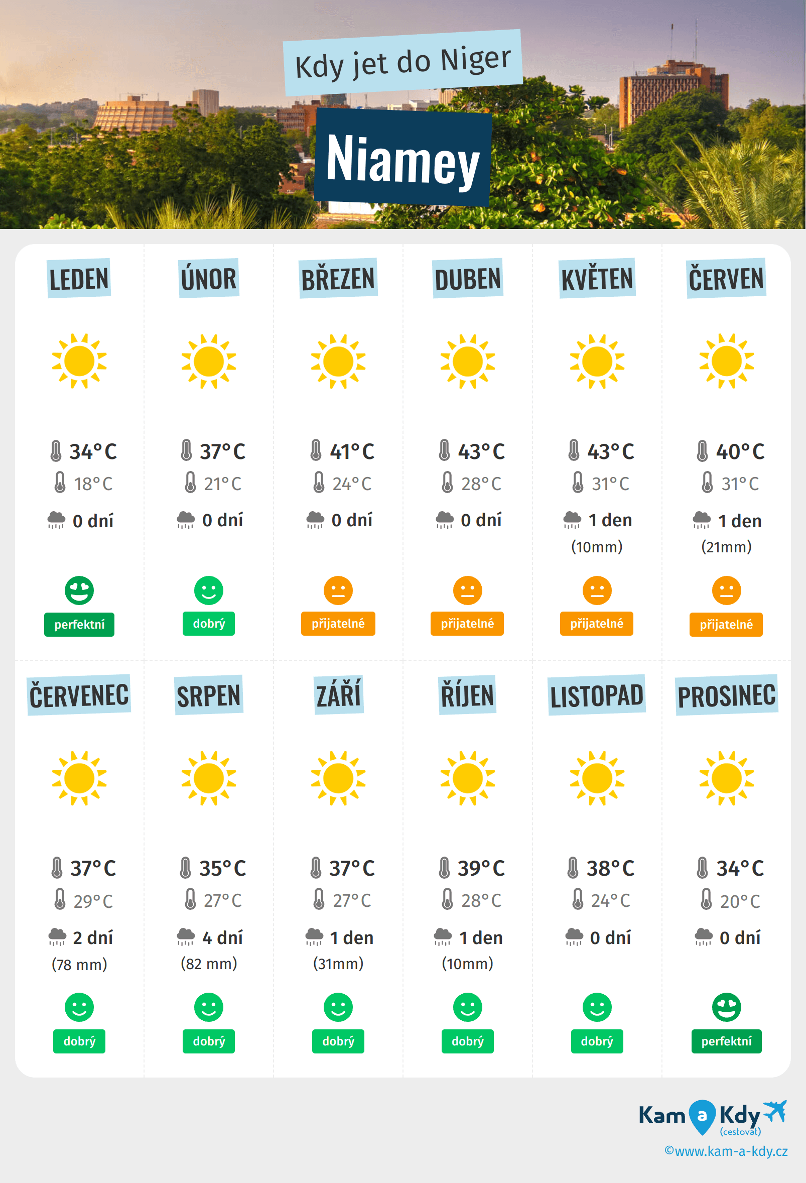 - Nejlepší měsíce pro dobré počasí v Niameyi jsou Leden, únor, červenec, Srpen, Září, říjen, Listopad a Prosinec