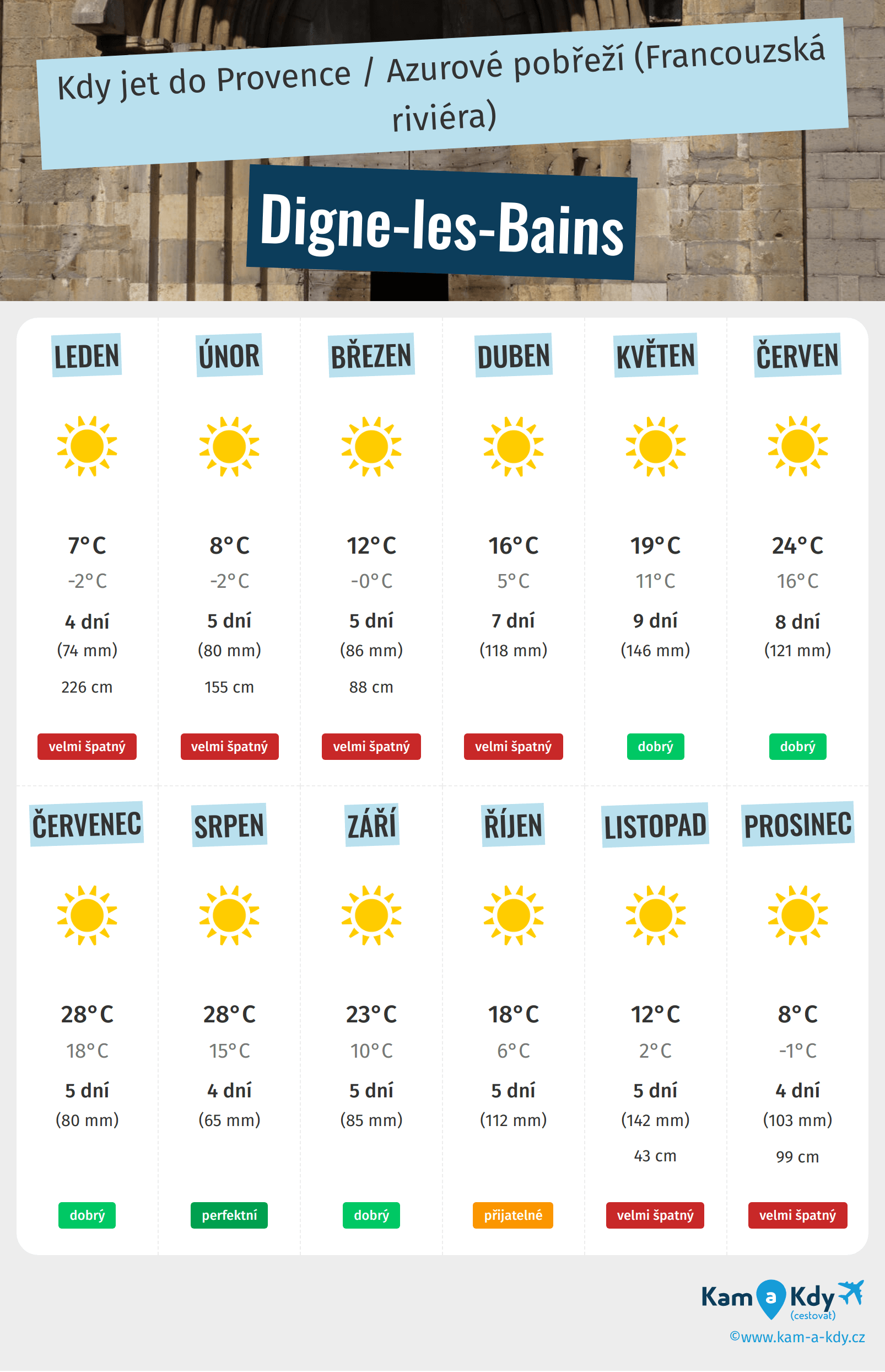 Kdy je nejlepší časpro cestu do Digne-les-Bains? Zde je několik informací, které vám pomohou při rozhodování: