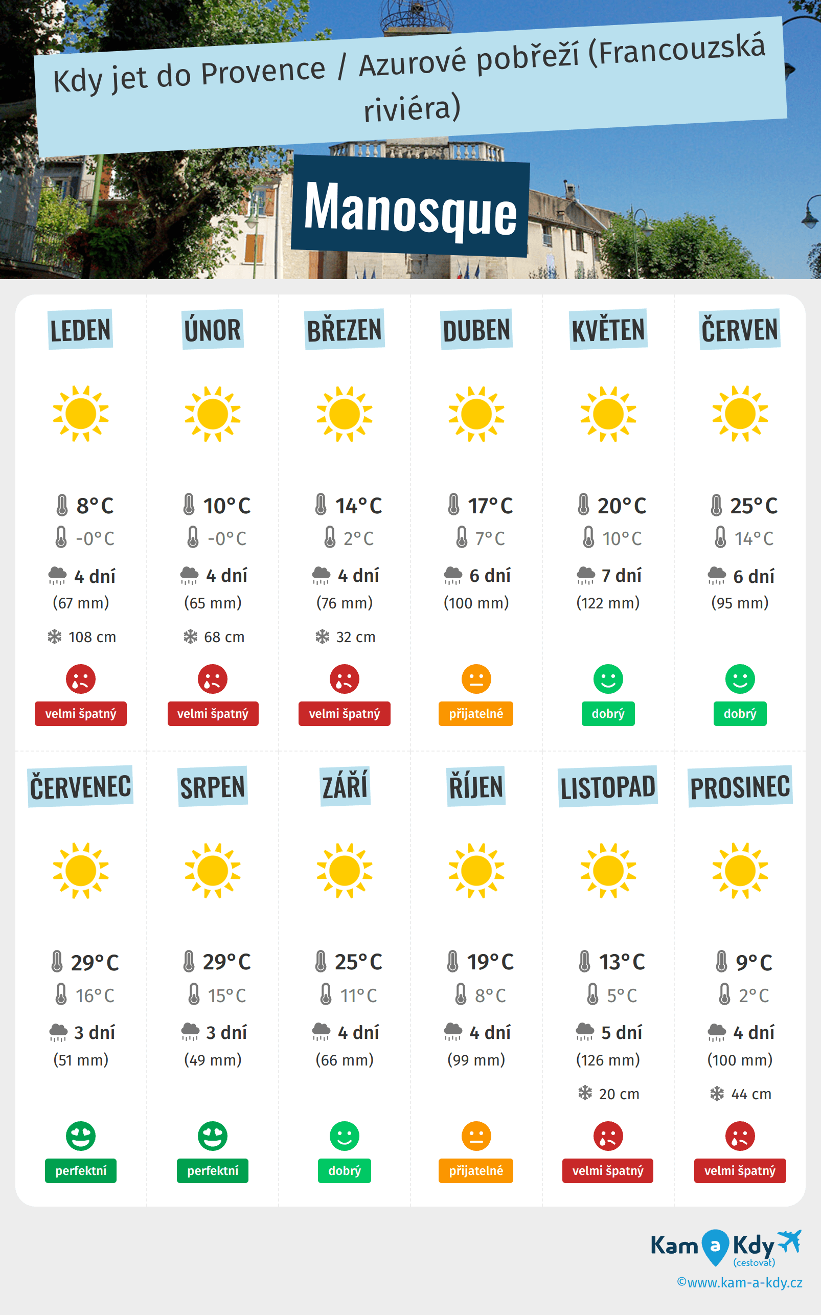 Kdy je nejlepší časpro cestu do Manosque? Zde je několik informací, které vám pomohou při rozhodování: